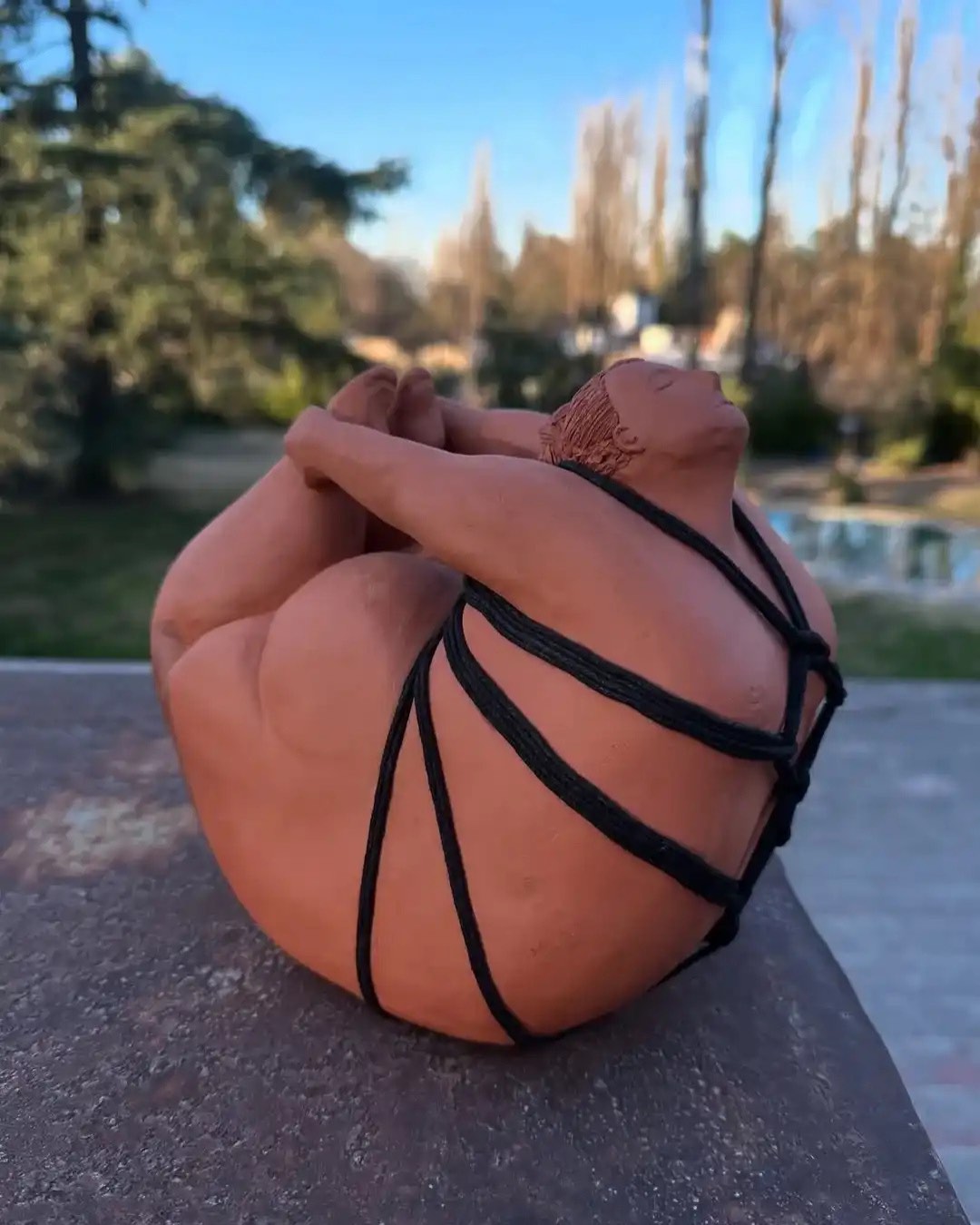Actualmente está plasmando y expresando su modo personal de percibir el mundo, el amor, la muerte, la sexualidad, los “temas viscerales que no encajan en lo normativo”. María Almodóvar está armando una muestra en la que expondrá sus esculturas shibari -el arte de atar con cuerdas-: “Se me ocurrió hacer ‘un gordo sumo practicando shibari’; las figuras humanas tienen los tonos terracota de la misma pasta de cerámica sin colorear, ese rojizo me da a piel”.