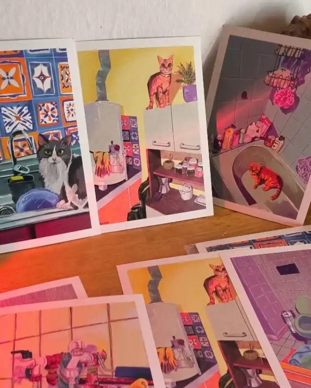 Además, ReSinfiltro está realizando ilustraciones con escenas cotidianas de su propia casa con sus gatos, de hecho la protagonista es Fiona, “la más compañera de los tres que tengo”. “Le encontré belleza a esas situaciones con las que convivo, al detenerme a mirarlas, las vi hermosas para ilustrar”, comparte quien primero toma una foto, luego hace el dibujo en una tablet y después imprime las láminas para entregarlas con su firma.