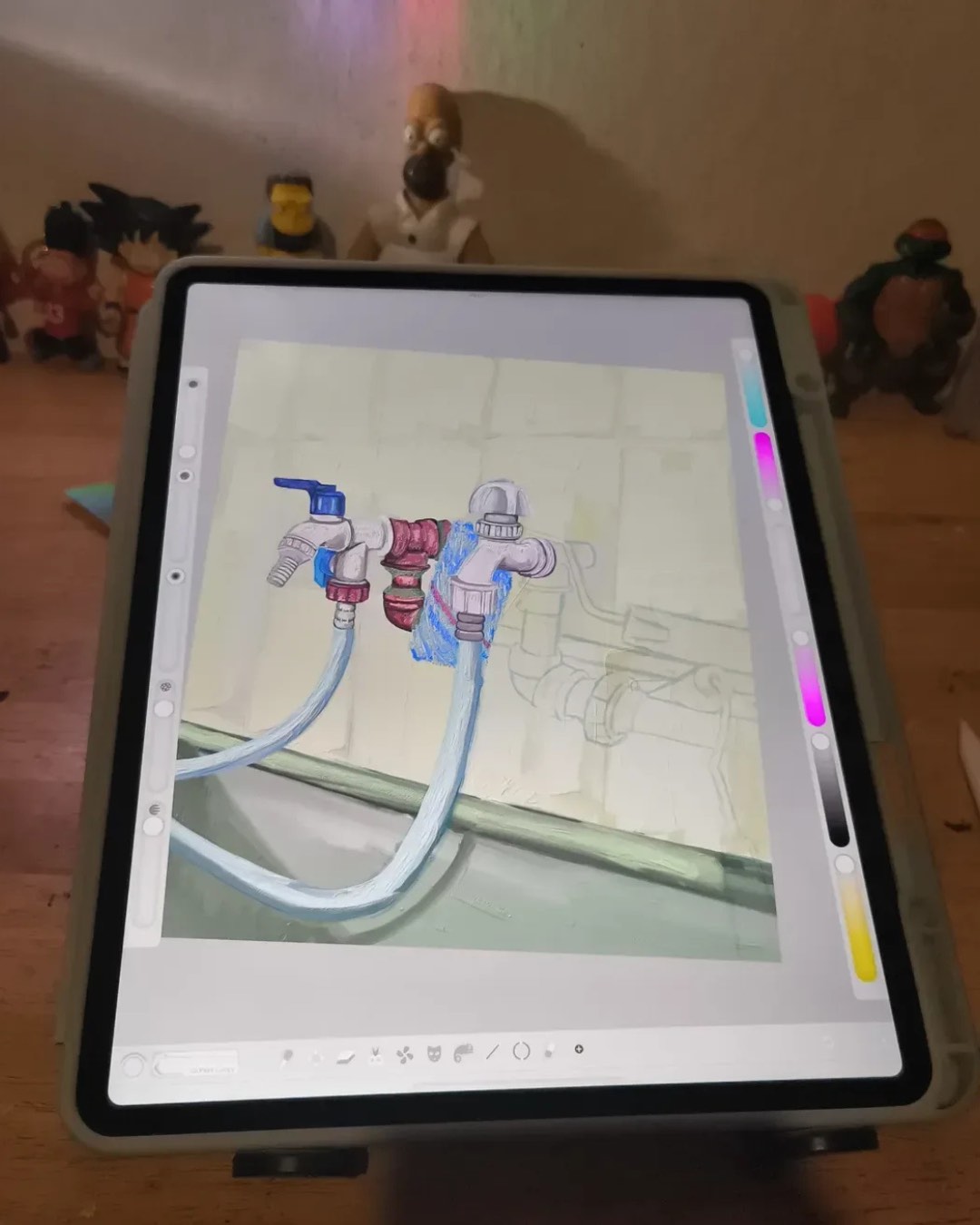 “Estoy a full con lo digital, le encontré la vuelta y me encanta la cantidad de posibilidades que pueden surgir mientras desde un trazo de fibra, un pincel o aerosol hasta los colores, me pongo a jugar con paletas y voy probando, si no me gusta, borro. Es muy entretenido”, dice el amante del color.