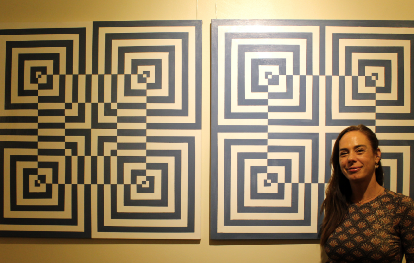 La pintora dedicada al arte óptico expone su nueva muestra en la que las líneas perfectas y las tonalidades estridentes «bailan» al ritmo de la música y las luces.