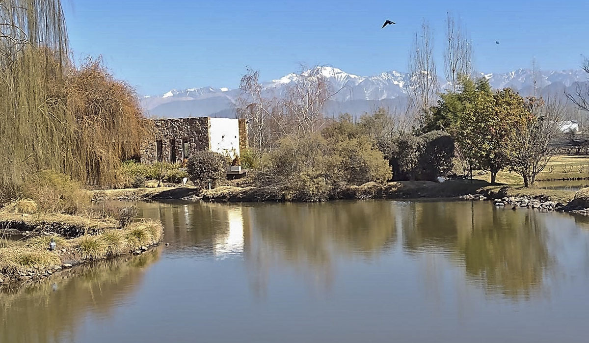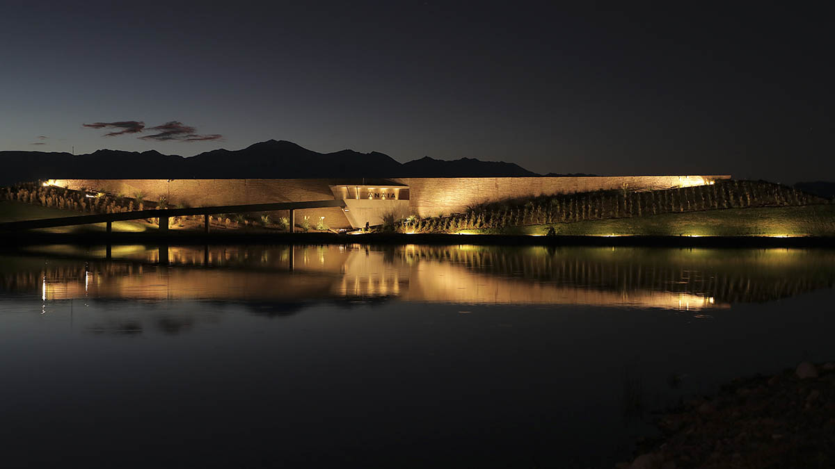 Viñedos delineados irregularmente, espejos de agua integrados con la arquitectura disruptiva de la bodega, novedosos mates de concreto para la crianza del vino conforman una escenografía impactante al pie de la Cordillera andina.