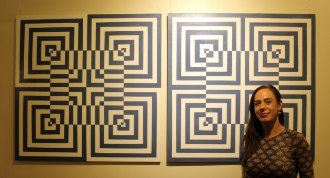 La pintora dedicada al arte óptico expone su nueva muestra en la que las líneas perfectas y las tonalidades estridentes «bailan» al ritmo de la música y las luces.