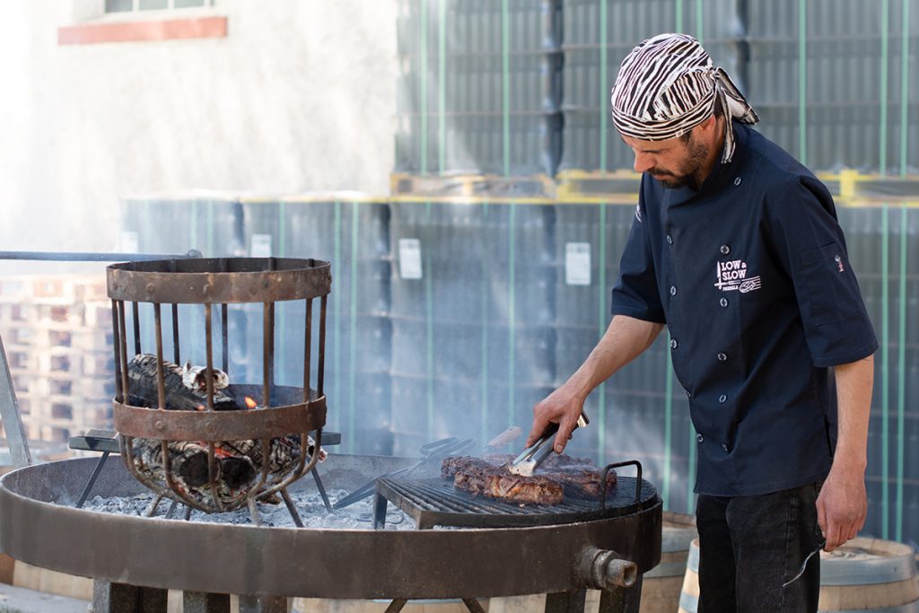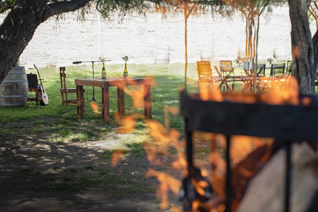La bodega conserva el estilo de época y en su interior un gran jardín invita a disfrutar de un almuerzo de cuatro pasos que ofrece su Grill 7 Fuegos. Mientras charlamos, Ignacio García, el chef de la casa elabora cada paso a la vista y nos cuenta de qué va el menú que nos espera. Por lo pronto nos pregunta cómo nos gusta el punto de la carne. El plato principal es un suculento ojo de bife que García ya prepara sobre la base de una antigua prensa de vino, que ahora es la parrilla.