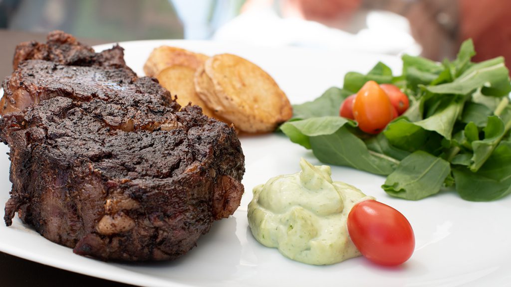 Para iniciar sale un delicado apeteizer: bastones de zanahoria con queso crema, albahaca, sal y pimienta. Como entrada Ignacio nos entusiasma con una mini brochet vegetariana y portobellos rellenos con salsa criolla decorados con un exquisito queso gratinado, luego unas empandas y de principal el ojo de bife con papas a la plancha, en el punto indicado para cada comensal, con la cocción perfecta. Realmente una delicia.