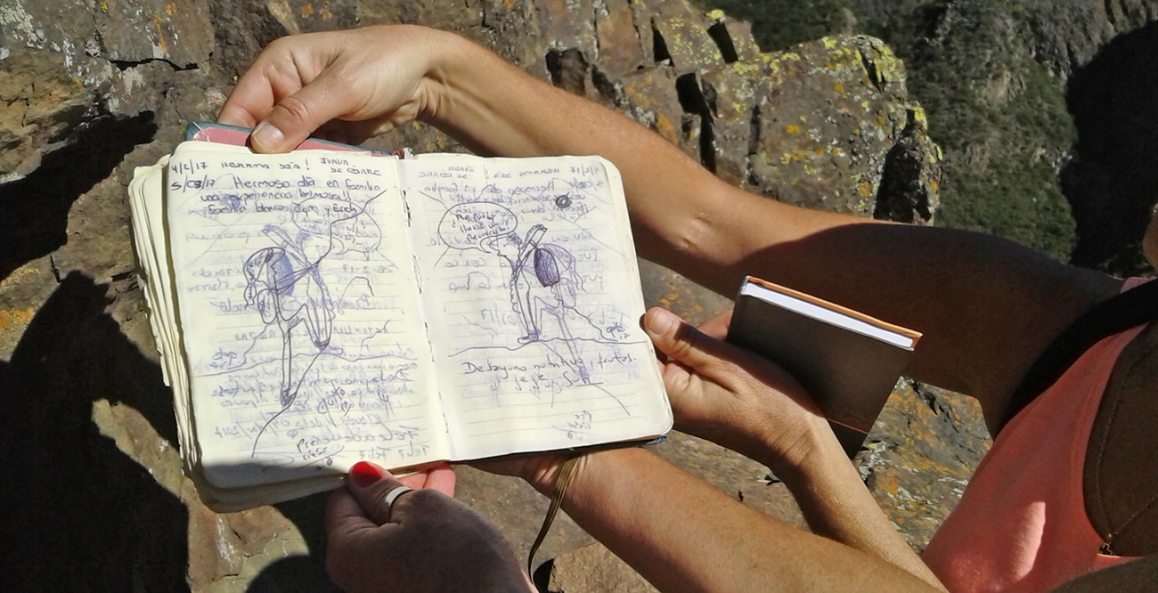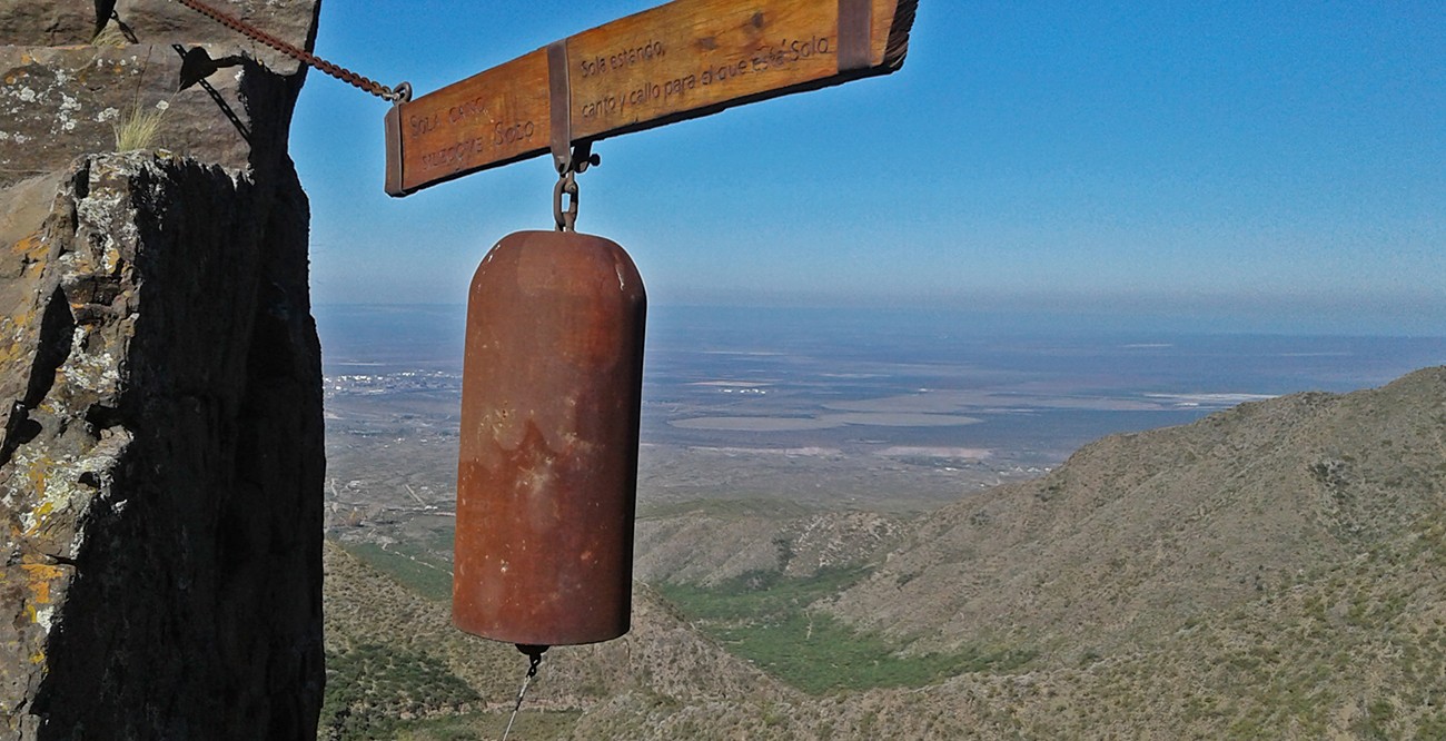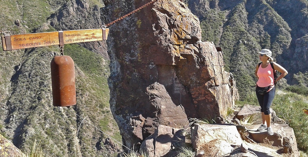 Tendremos que caminar un rato más hasta empezar el ascenso más abrupto hacia las campanas. Una vez arriba podemos volar. Hacia el oeste tenemos una incomparable vista de la quebrada que se pierde; hacia el este, desde el peñón más alto dominamos todo el piedemonte y hacia el sur el precipicio de la quebrada. Por ahí sube el eco de las voces de los que vienen atrás y piden campanadas. La hacemos sonar una y otra vez, después husmeamos el cuaderno de firmas que se preserva de lluvias y vientos en un tupper de cocina. Aquí los visitantes dejan sus impresiones, sus sensaciones, sus frasecitas, sus dibujos, sus nombres. Resulta toda una curiosidad.