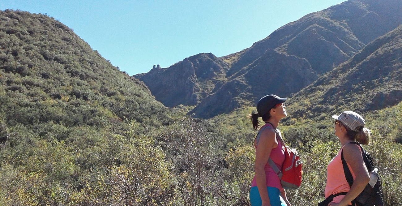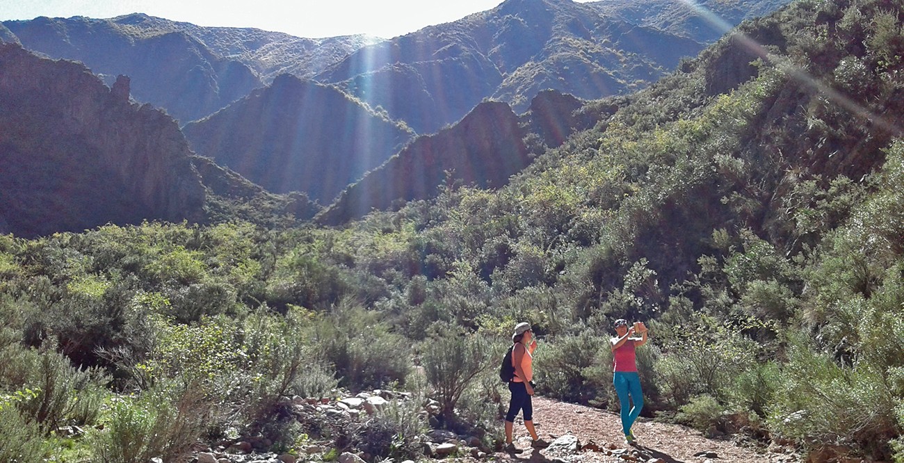 Por el mismo camino que nos lleva a la vertiente de los sauces y la base del Negro (2.200 msnm), al llegar a una cisterna de piedra tenemos que tomar el sendero de la izquierda, por ahí bajaremos a la cañada. La marcha es tranquila y fácil sobre la arenilla de arrastre que deja el agua cuando baja. Durante todo el trayecto nos acompaña el arroyo que baja de la vertiente. El sendero cruza una y otra vez su curso. A diferencia de muchas quebradas, en esta cañada la vegetación es abundante y verde, con algunos árboles perfectos para hacer el picnic de refuerzo.