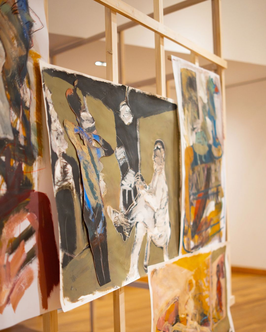 Caminamos entre las maderas, asomándonos a las obras como espías. Es un juego constante entre lo que se oculta y lo que se devela. Las obras, trabajadas sobre papel con carbonillas, acrílicos y lápices, no están enmarcadas de forma rígida: tienen recortes, dobleces, partes que se escapan del soporte. Son, literalmente, desbordes.
