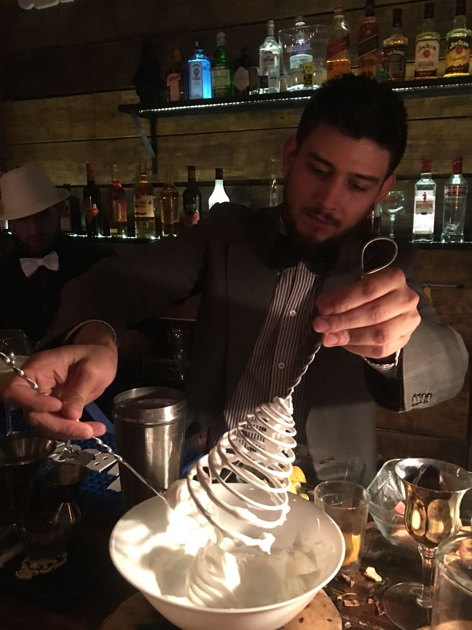 La propuesta del bar oculto es agradable a la vista y se elabora con una herramienta traída especialmente de Perú: un batidor llamado globo o vestido de dama. «Éste genera una micro-espuma en la clara de huevo y hace que la isla de merengue tenga una densidad que no se puede lograr de ninguna otra manera», aclara uno de los propietarios del lugar. Y lanza «Nos la jugamos con todo».