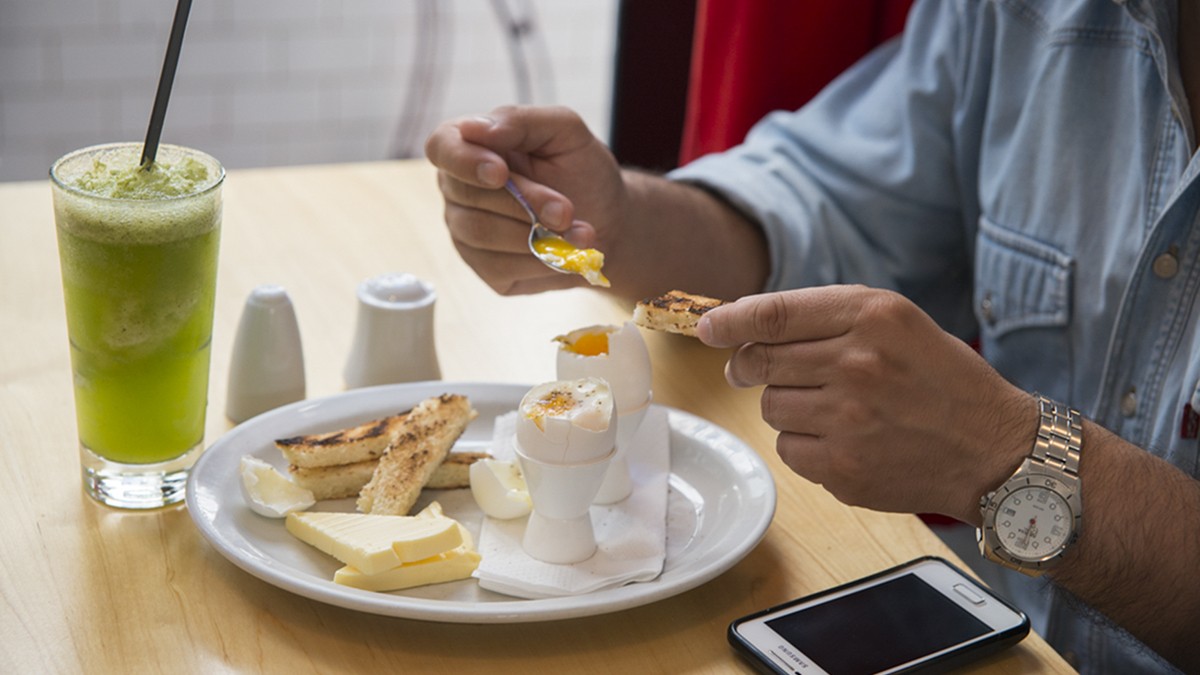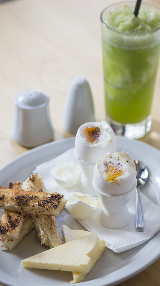 Los jugos jugan un papel importante en el menú de desayunos para los días de calor en el restorán de Vanina Chimeno. Por eso también probamos un tostado de jamón y queso (de soberbia presentación, lejos de lo que parece algo esperado), combinado con un jugo de naranjas, y un huevo pasado por agua, con manteca y la compañía de una limonada con menta y jengibre.