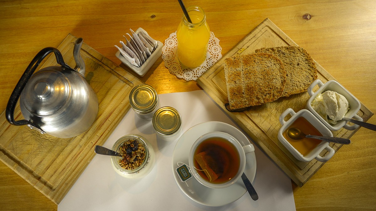 Desayuno green: Tostadas en pan de semillas/queso crema y miel/yogurt natural con granola/jugo de naranjas.