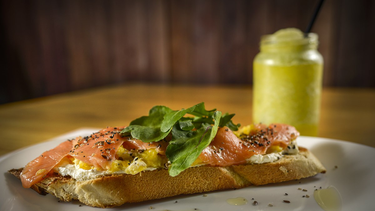 Tostón de salmón: Crema ácida/huevos revueltos/salmón ahumado/semillas