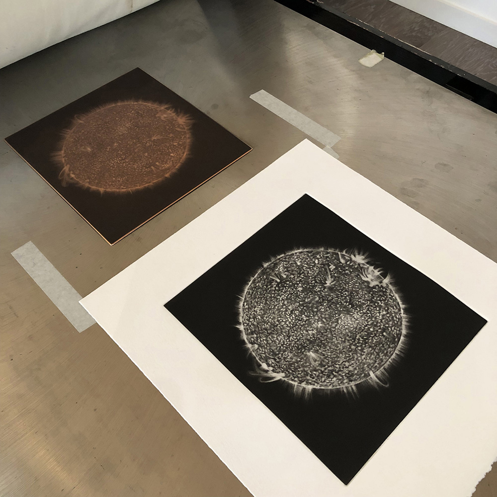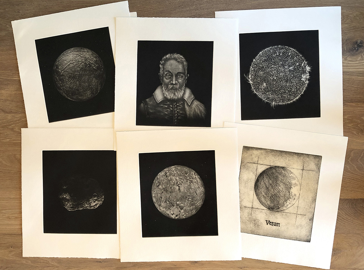 La mayoría de la obra de Eduardo Fausti incluye grabado-mezzotintas y monotipos. «En la Isla Orcas me reencontré con los cielos estrellados que tanto observaba en Mendoza y comencé a realizar representaciones en mezzotintas de cuerpos celestes, cometas y meteoritos».