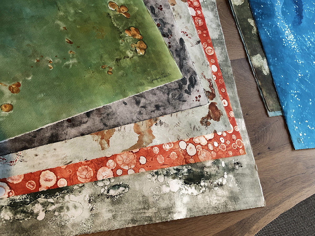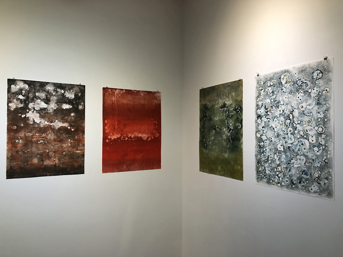 Respecto a los monotipos con los que está trabajando en este momento, «son lo opuesto a los grabados ya que son obras de mayor tamaño, más espontáneos, realizados con tintas de color y basados en mi respuesta emocional al medio ambiente de la Isla Orcas».