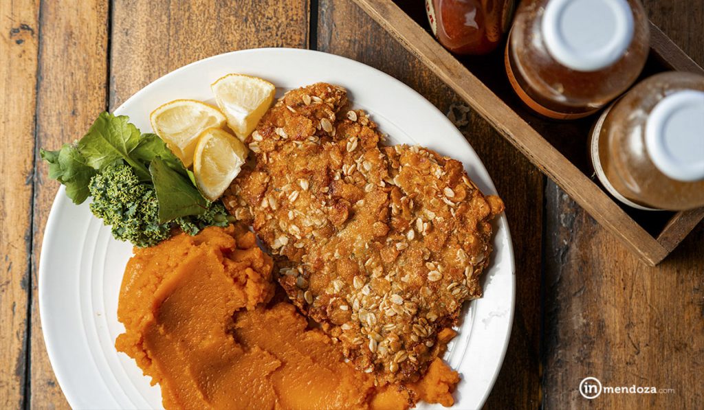 Para quienes comen carnes se incorpora una milanesa de pollo rebozada en cereales y avena con mousseline de calabaza. Todas las propuestas maridan a la perfección con sus jugos naturales y con su coctelería clásica.