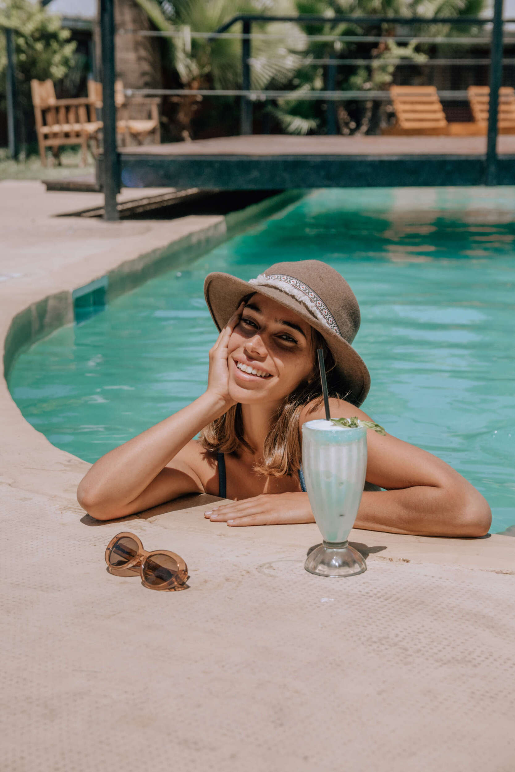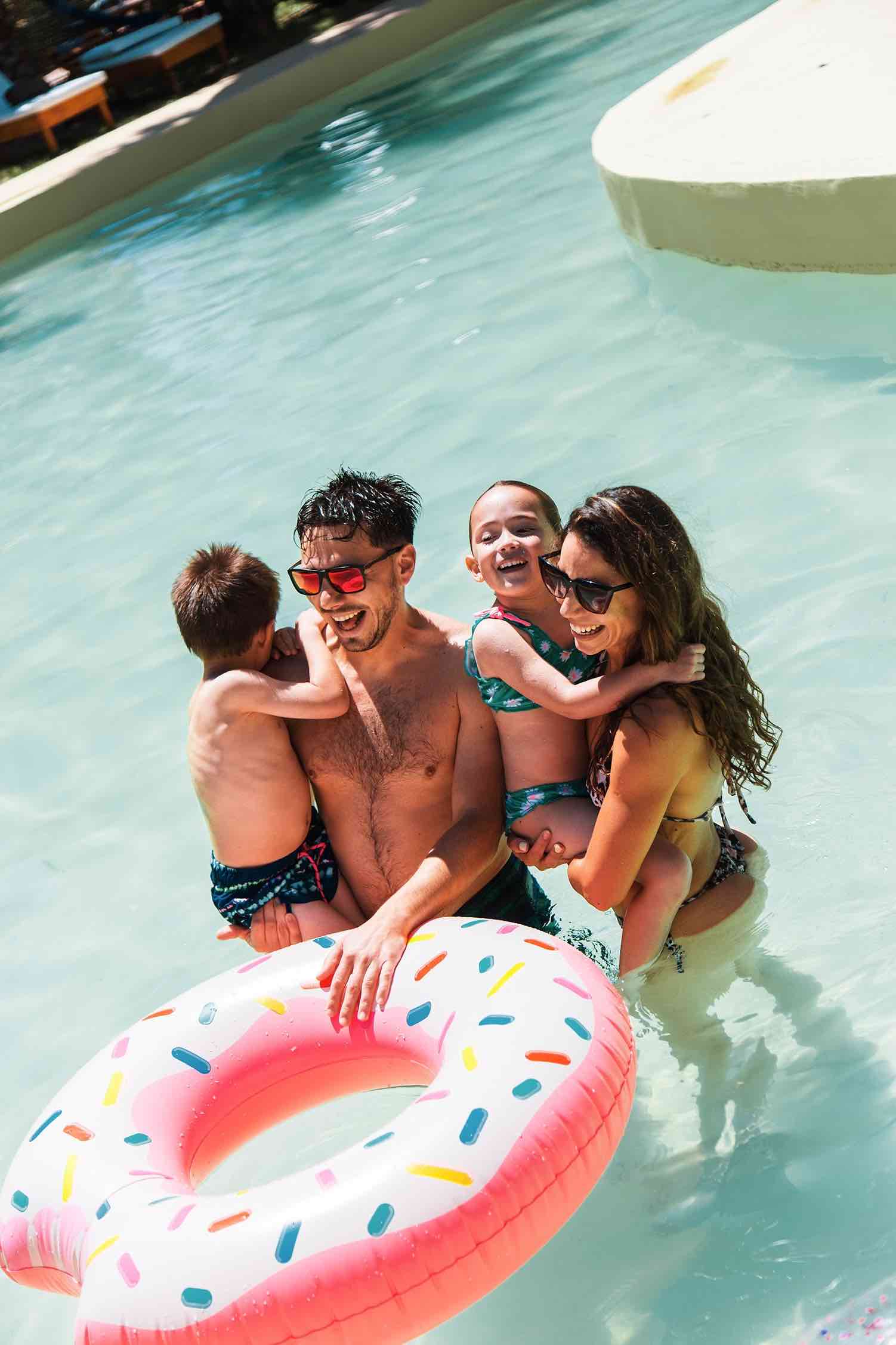 En su predio disponen de dos grandes piscinas -una con isla central que realza su estética tropical y otra de menor profundidad- y amplios espacios verdes donde el tiempo parece detenerse. A su alrededor, reposeras, zonas de picnic y sectores recreativos invitan a pasar el día entero al aire libre.