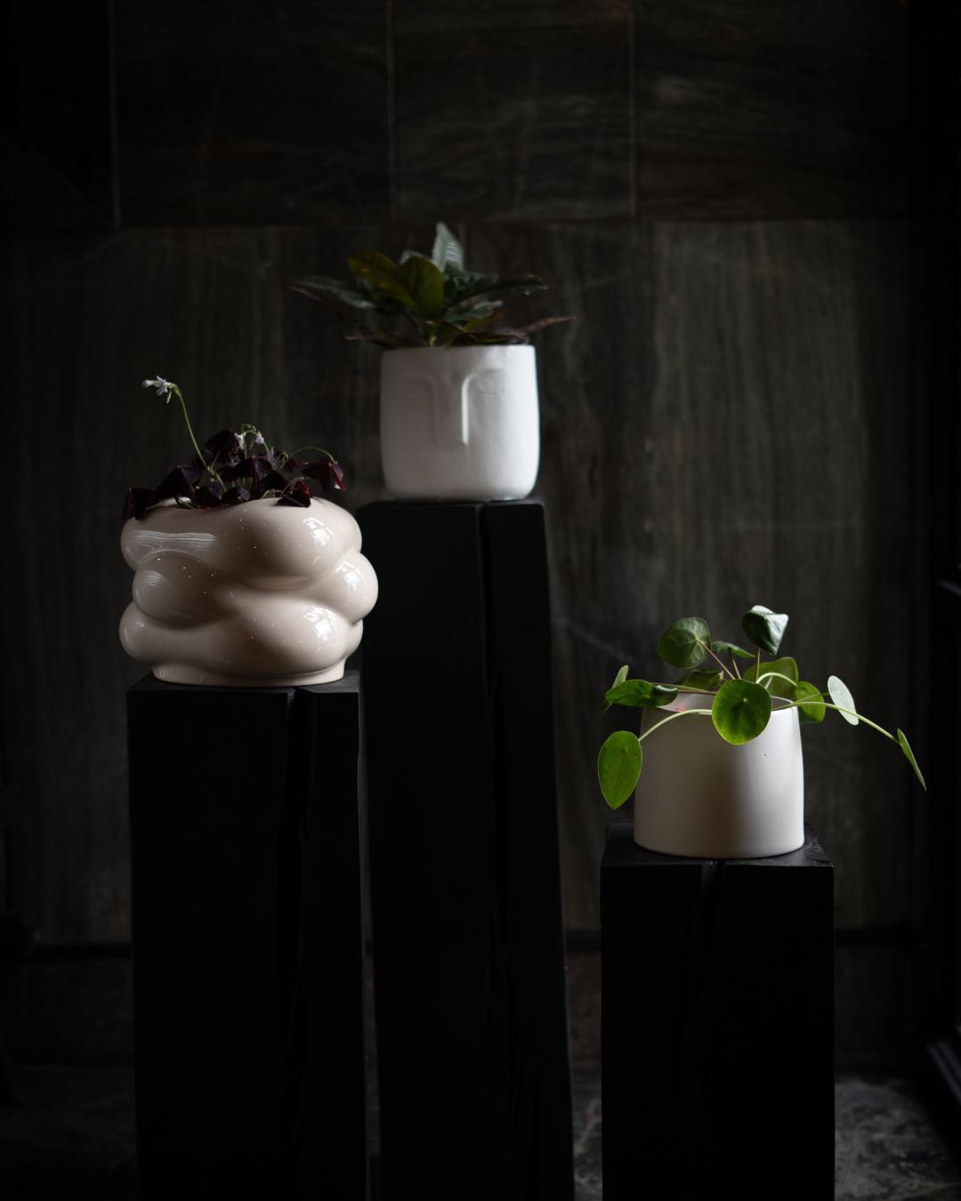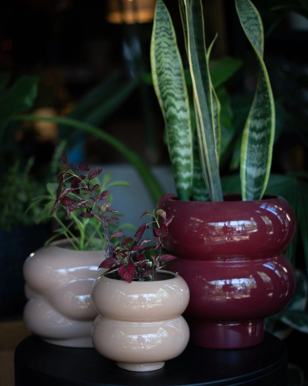 En este combo se combinan una maceta Duomo grande color arena, una Sienna chica del mismo tono y otra Sienna XL con plato color bordó, logrando un juego de texturas, tonos y alturas.