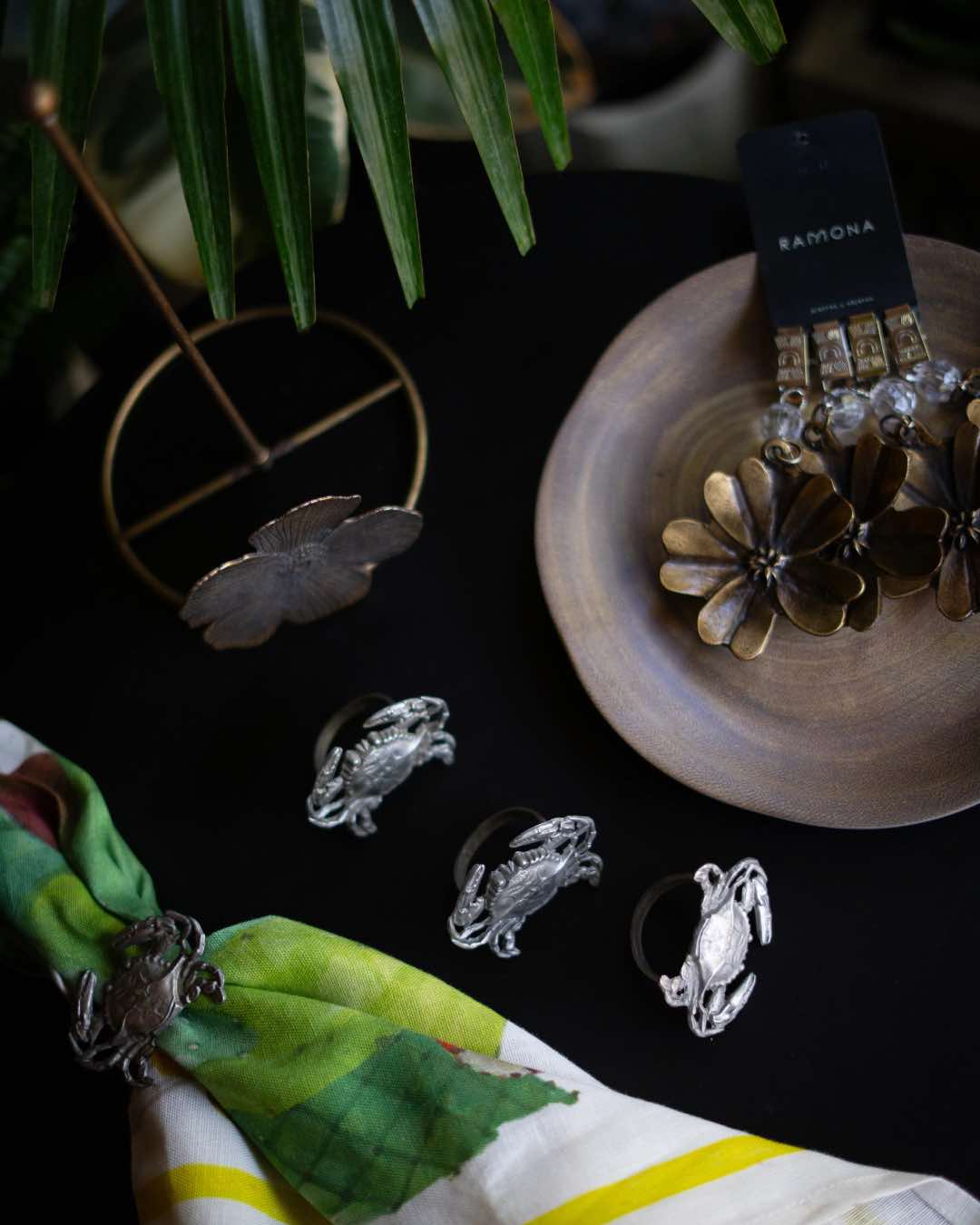 Un porta rollo con flores de bronce, servilleteros con forma de cangrejo, pesa manteles y cuencos de madera crean una mesa que invita a compartir y celebrar con estilo.