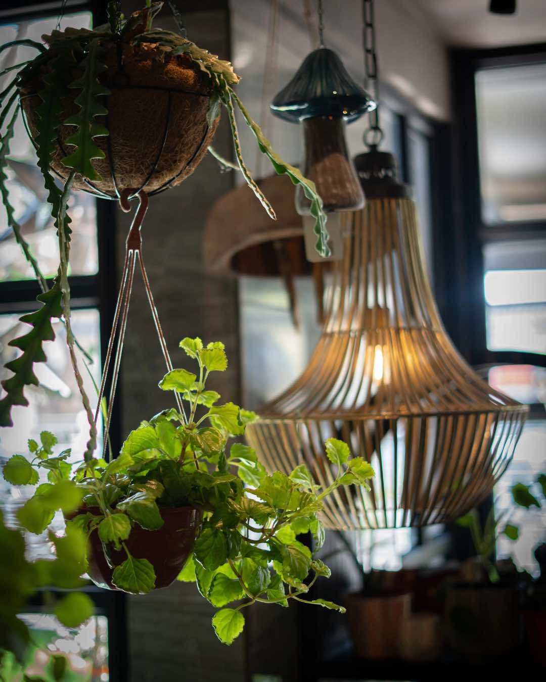 Para ambientar de forma elegante y diferente, las macetas colgantes son una gran opción. En Ramona se destacan las de coco, que pueden combinarse con una versión rústica para jugar con los niveles desde el techo o desde alguna estructura.