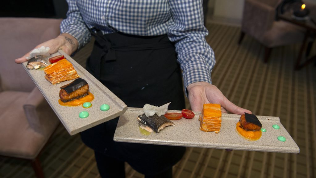 Carpaccio de beteraba con mouse de parmesano y salsa de gremolata o una degustación de empanadas (pollo y queso azul, arañita braseada, zucchini hongos y parmesano), son algunas de las opciones para las entradas. Achicoria, lollo roso, kale frito, huevo codorniz con aderezo de frutilla, aceto y crocante de arroz, es otra de las ensaladas preparadas y, en principales hay, por ejemplo, salmón en velo de tinta de calamar acompañado con mil hojas de zanahoria y emulsión de té verde o esfera de lentejas, cremoso de pimientos amarillos con yogurt natural cítrico.