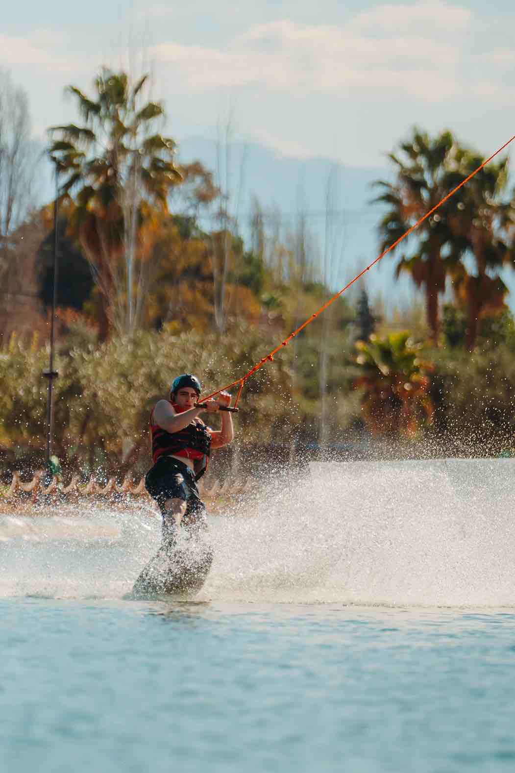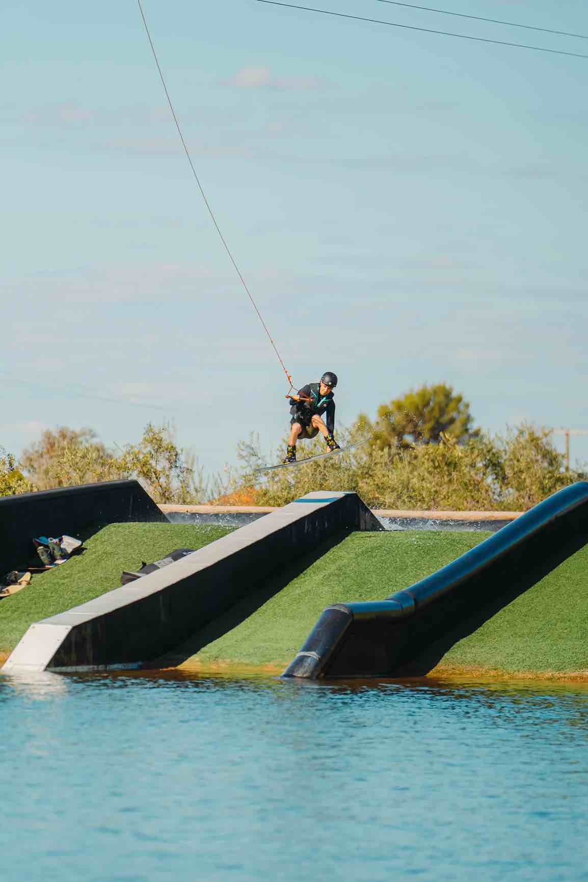 En el sector de wakeboard, un sistema de cable-carril eléctrico recorre la laguna artificial de 220 metros de longitud que propone un circuito de obstáculos, ideal para profesionales o principiantes que quieran sentir la emoción de deslizarse sobre el agua.