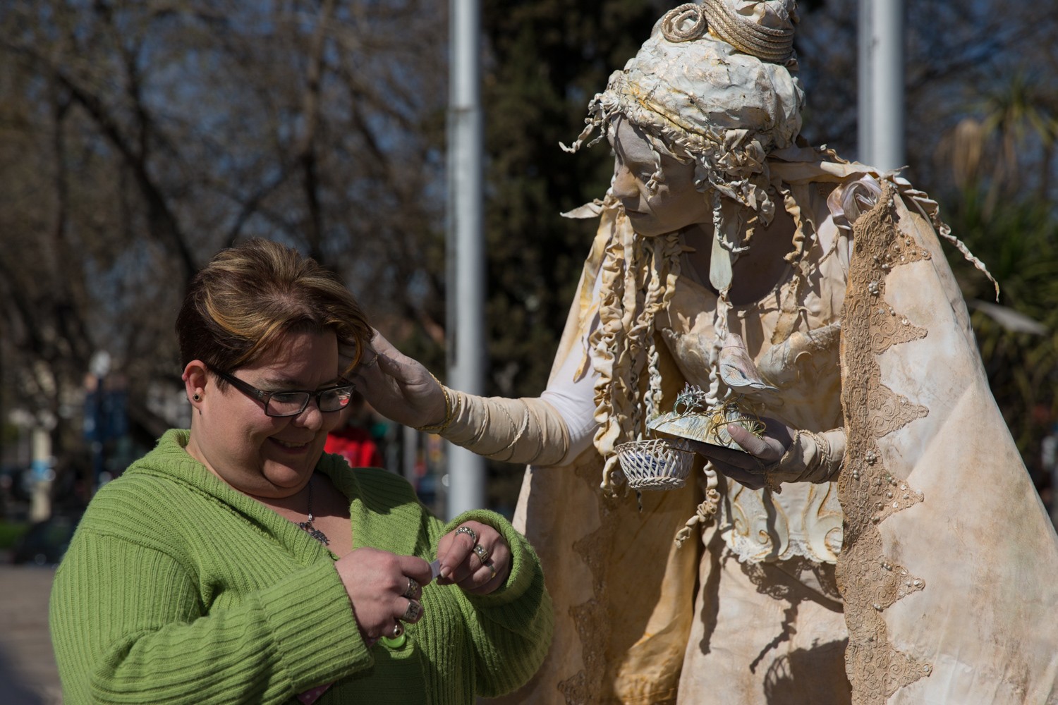 Las estatuas vivientes, también conocidas como las estatuas blancas o estatuas humanas, son actores que permanecen inmóviles por largos períodos de tiempo formando un hermoso decorado viviente en las ciudades. Su mirada casi siempre está perdida en el vacío y se encuentran en un espacio atemporal donde residen por un tiempo determinado y provocan una paz interior y un estado de contemplación a quienes los observan.