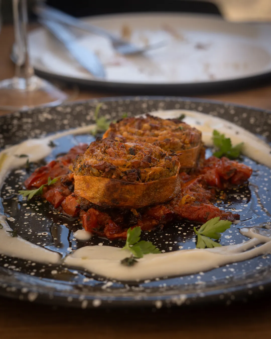 Continuamos con los “The Freaky buñuelos” hechos de lentejas, girasol y repollo crudo, acompañados de crema verde de zucchini con un picor espectacular y una torre de papas bien finas espolvoreadas de ceniza de calabaza. Un lujo. Al pedir la ensalada, la mente imaginó un bowl fresco pero llegó una versión que nos alegró el corazón: “Rojo furioso” es su nombre y parece una obra de arte por las tonalidades y presentaciones de la remolacha, los cítricos y ricota.