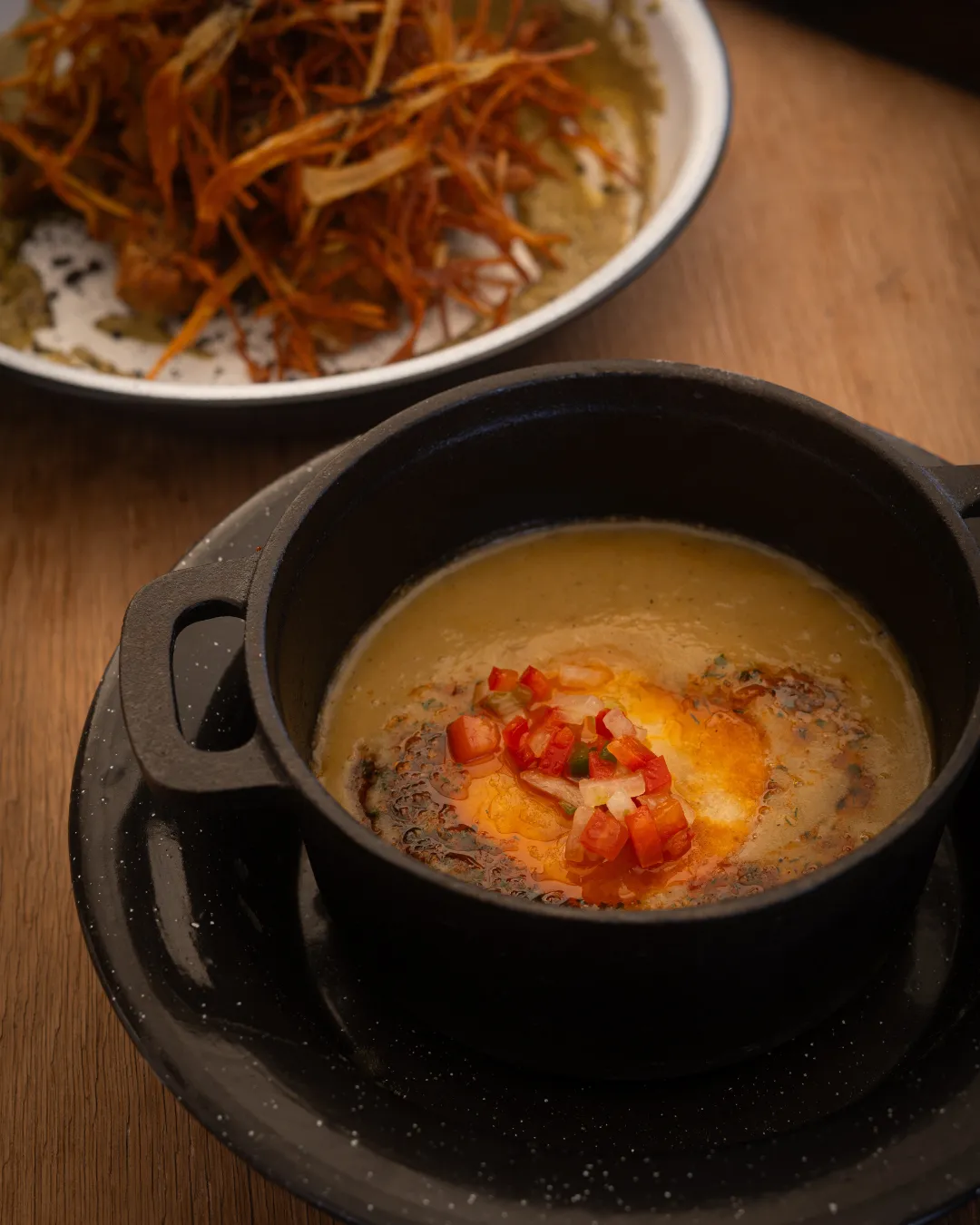 Tuvimos la oportunidad de probar el menú degustación por lo que siete pasos desfilaron por nuestra mesa y cada uno nos hizo bailar de la emoción por los sabores distintos, los métodos de cocción combinados y los colores y texturas que daban vida al plato. Comenzamos con la “Sopa de otro pozo”, de cebollas caramelizadas en el horno de barro con un chimichurri cítrico espectacular sobre una sopaipilla que aportaba el crocante perfecto.