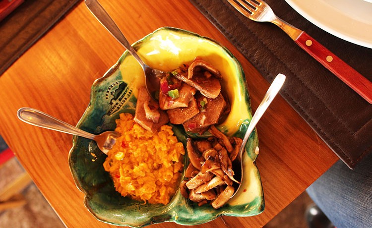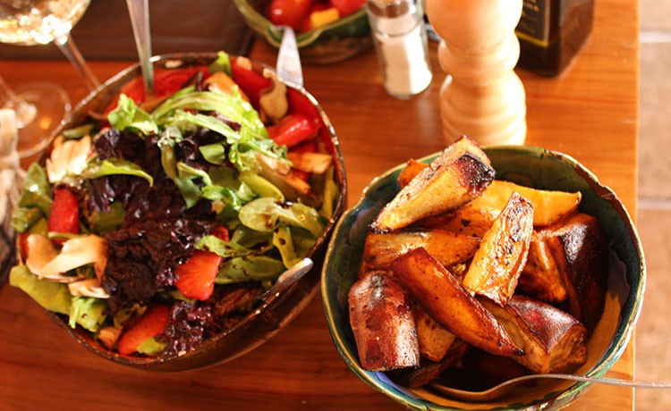 Tomatitos cherry caramelizados con queso y otras variedades de ensaladas anticipan las empanadas de carne cortada a cuchillos con una masa casera deliciosa. A esta altura degustamos el Cadus, un insuperable Bonarda de Nieto Senetiner, de las fincas de Agrelo. Inmediatamente el mozo nos pregunta el punto de preferencia para la carne y minutos después nos sirve la parrillada en distintas etapas. Chorizos, morcillas y tira de asado para empezar, un corte de cerdo con ananá asado a las brasas y un vacío cocido a la perfección. Sobre el final, la codiciada entraña crocante con el punto ideal supera nuestras expectativas.