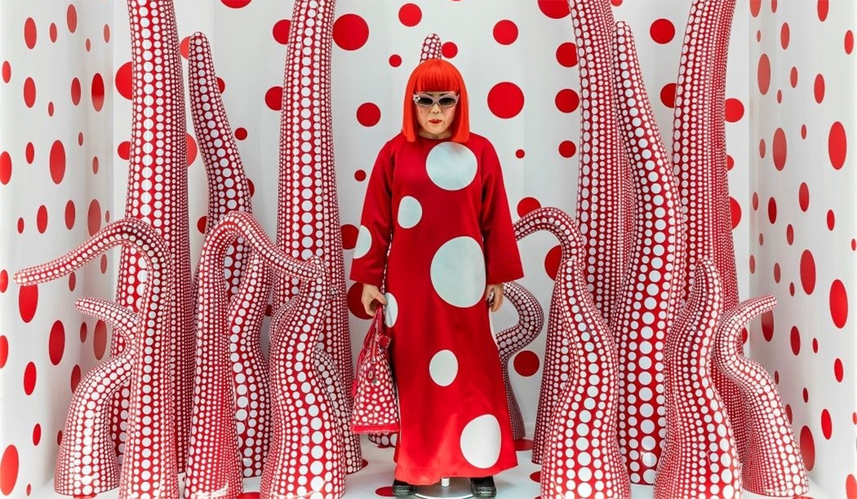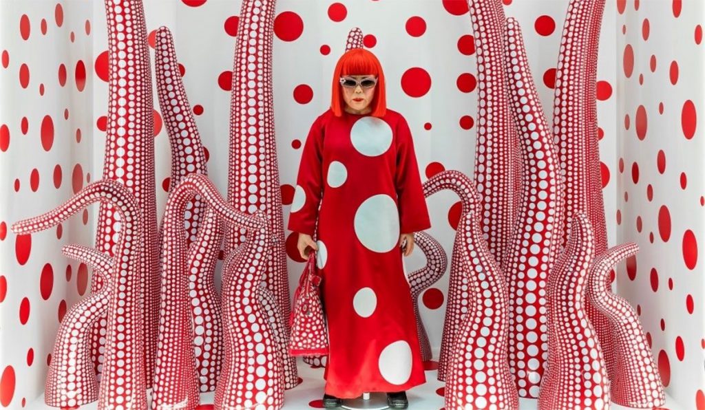 Lo curioso es que en 1993 (después de haber sido prácticamente rechazada y no invitada en el 66) le pidieron que representara a Japón en la Bienal de Venecia. Ese fue el año que colocó a Kusama en otra dimensión y su obra comenzó a cotizarse en una escalada increíble. Pasó de entregar sus narcisísticas bolitas de espejo por dos dólares a lograr que Sotheby’s vendiera la obra Star en 290.000 dólares. En 2008 vendió Redes Infinitas en 5.1 millones de dólares y en 2014, Christie’s subastó la obra White No. 68 (1960) en 7.109.000 dólares. Sus puntos se extienden hasta las carteras de Luis Vuitton que le dedicó a la artista una colección entera.