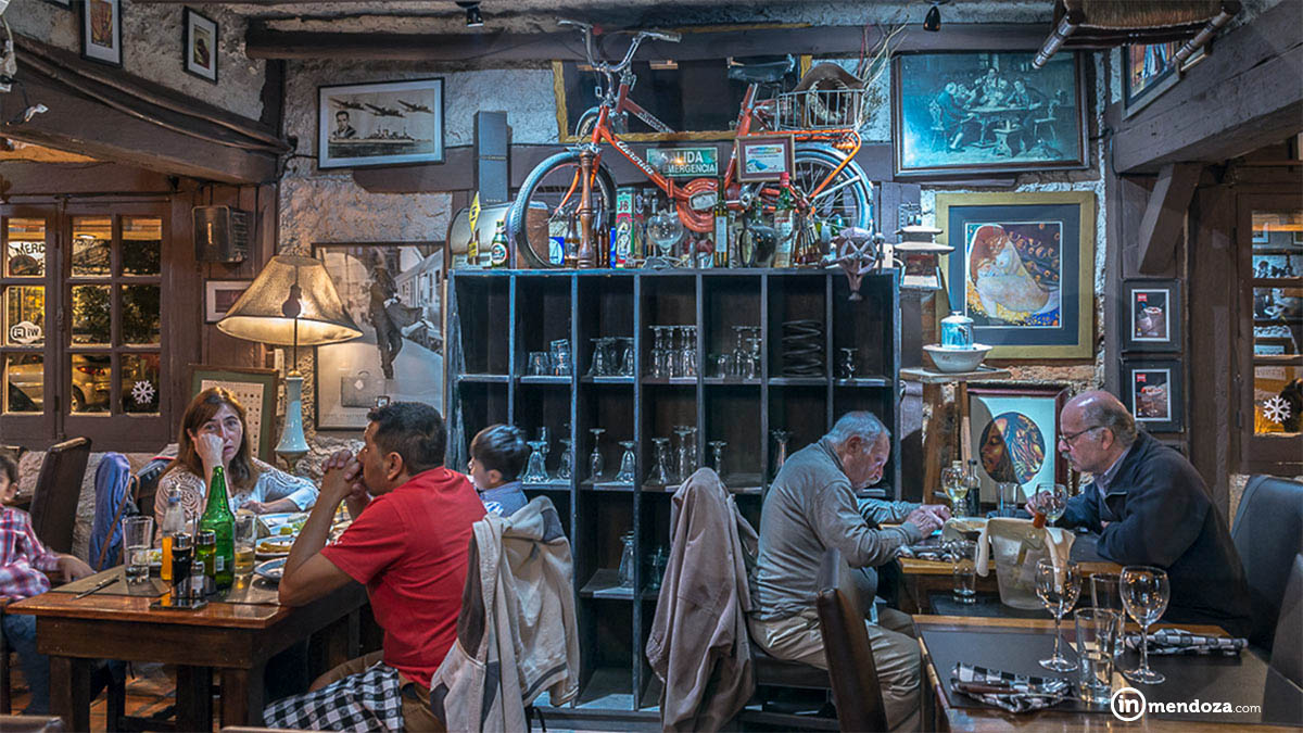 El fuego que se refleja en el vidrio y la gran parrilla con cortes de todo tipo, impactan al pasar por el lugar e invitan a ingresar (sea la hora que sea). El olor a carne sobre las brasas es tan irresistible y atrapante que, sin pensarlo, cruzás la puerta en cuestión de segundos. Una vez adentro, la atípica decoración hace que se abran más los ojos y se despierte nuestra curiosidad ante tanta variedad de cuadros, fotos, botellas y objetos antiguos (teléfonos, televisores, bicicletas) que encajan a la perfección con el techo repleto de las viejas sillas del lugar, colocadas estratégicamente.