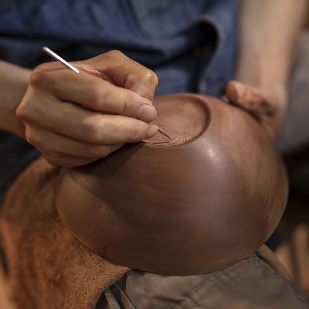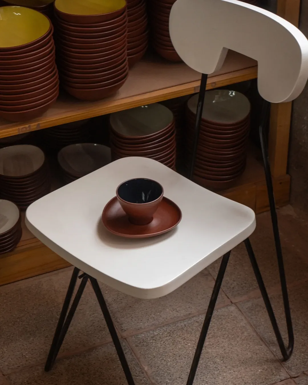 Sus piezas —de producción semiartesanal— llevan la huella de ese encuentro entre el gesto manual y la precisión del diseño. Están hechas en gres natural, cocidas en hornos de fuego lento y esmaltadas con pigmentos creados especialmente para la marca, logrando verdaderos objetos de colección. Además, cada pieza lleva inscripta en su base la fecha de producción, el número de serie y el número del artesano que termina de darle la forma, previo a su cocción final. No hay dos iguales y en esa diferencia reside su potencia.