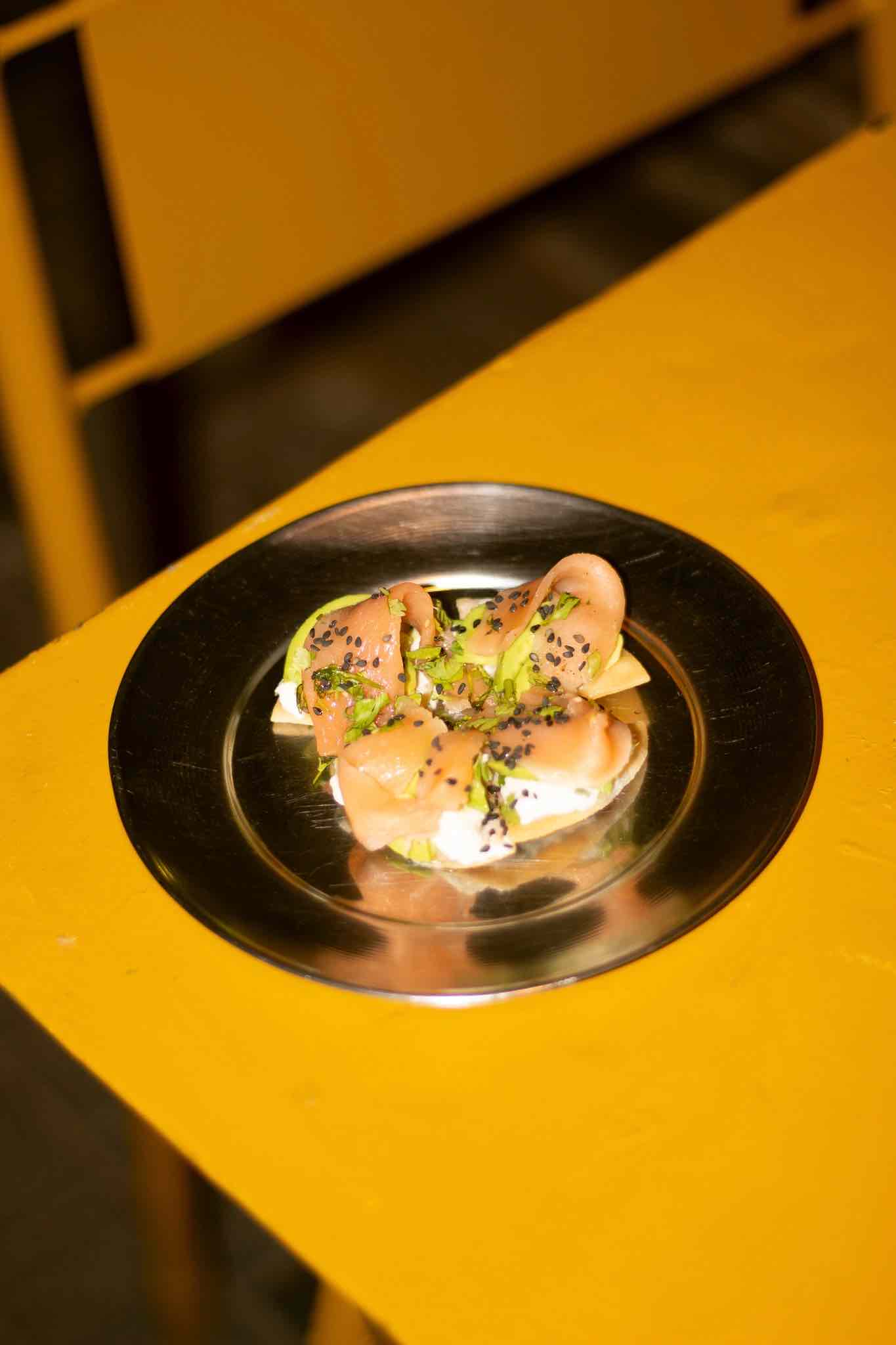 La experiencia gira en torno a la barra y a un sector “de parado” que rompe con la lógica tradicional de mesa fija. Acá se puede circular, conversar, cambiar de lugar y dejarse llevar por una propuesta que mezcla snack food, vinos y coctelería en partes iguales. La carta es simple pero con giro: tapas finger food en porciones individuales, pensadas para comer apoyado, charlando o escuchando música, sin necesidad de sentarse.