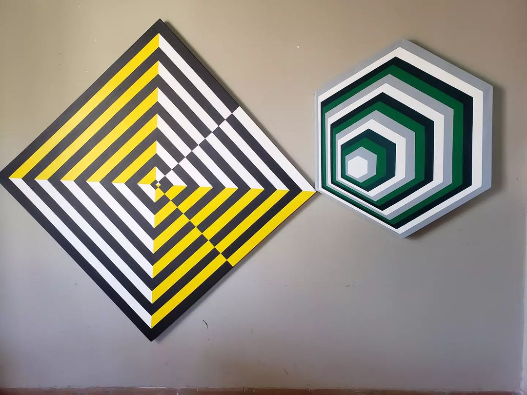 Desde hace más de 20 años que pinta líneas y mientras más perfectas le salgan, más placer le da. Ya son parte de su vida como también los diferentes colores que logra en los acrílicos que utiliza. «No solo las líneas generan arte óptico, también el aporte lumínico, ese que le doy jugando cuando el diseño quedó terminado».