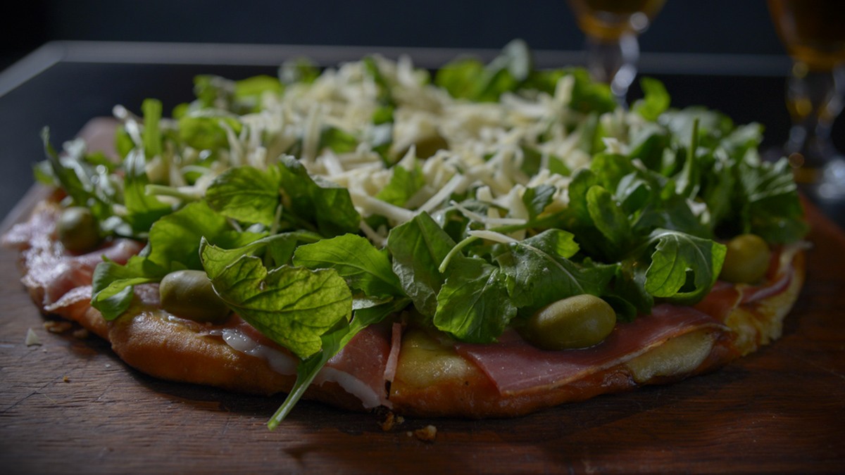 - Pizza Serrana: rúcula, jamón crudo, muzzarella y parmesano.