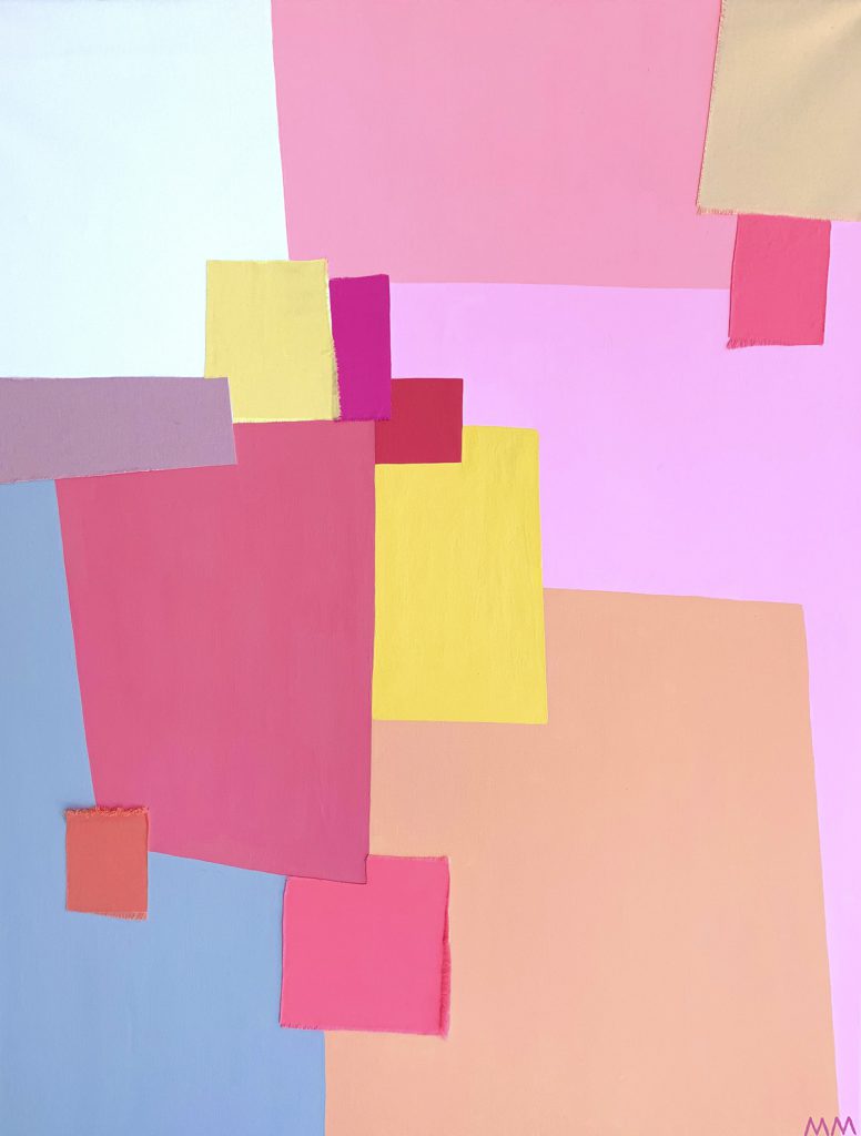 Me siento muy identificada con mi paleta de colores, todas las colecciones han sido apasteladas -o pastel- y al mismo tiempo vivaces. No uso colores oscuros ni negros. Mi obra actual es contemporánea, deconstructivista y forma parte del expresionismo abstracto ya que es una exploración de los sentimientos, emociones y conceptos a través de formas geométricas, trazos con líneas asimétricas y colores depurados. Es una expresión de arte perfectamente imperfecto, que permite al espectador cerrar la obra a su imaginación.