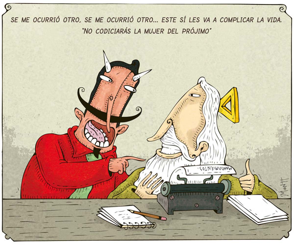 Dios redacta a máquina un prolijo listado. Son los mandamientos destinados al hombre. Pero, al parecer, no se le ocurre qué nuevo precepto incluir en la lista. Hasta que el Diablo, a su lado, eufórico, una idea flamante: «Se me ocurrió otro. Este sí les va a complicar la vida: “No codiciarás la mujer del prójimo”».