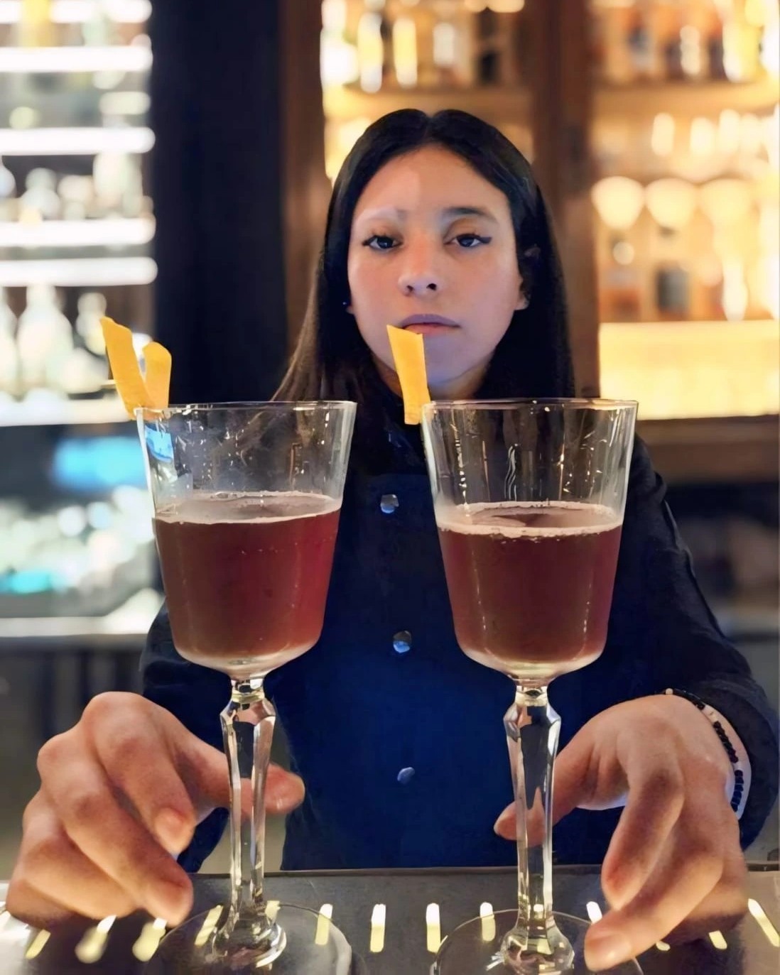 La coctelería, para ella, es más que técnica. Es diálogo. “Me gusta charlar con quienes tengo del otro lado de la barra, compartir historias. Eso me representa”, dice. Y esa búsqueda narrativa también la traslada al momento de crear: cada cóctel es una pequeña historia construida a partir del origen de las frutas, las bebidas y los procesos que confluyen en el vaso. Un viaje sensorial y emocional.