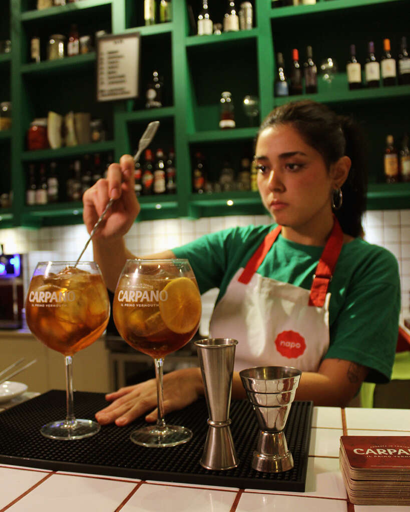 Entrar al nuovo Napo ubicado en Avenida Perú 1299 de Ciudad es como viajar inmediatamente a Italia ya que toda su estética nos remite a la cultura tana, los colores de su bandera están presentes en cada rincón y el mural dibujado a mano nos acerca los sitios más icónicos de Nápoles.