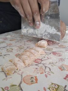 Formar tubos y luego cortarlos en cuadrados, aplanar un poco el centro para poder rellenarlos.