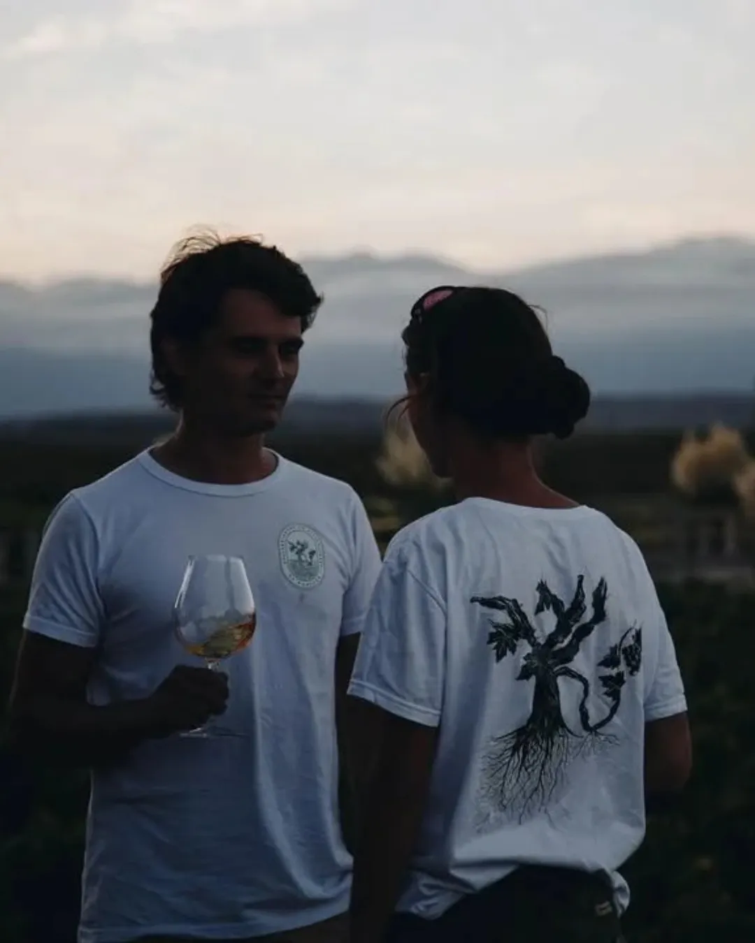 Además, junto a su pareja, Franco Galigniana, desarrollan Descendientes de Viticultores de Montaña, proyecto que saca el lado más técnico y preciso de la joven enóloga. Acá la apuesta fue transformar una finca convencional hacia un viñedo vivo y equilibrado mediante agricultura regenerativa. «Sentía que no iba con mi filosofía hacer vinos naturales pero viniendo de una viña que no lo era. No me sentía cómoda», cuenta Paula. El proceso requiere paciencia: plantar especies nuevas, devolver vida al suelo, confiar en los microorganismos invisibles. «Es más tiempo, más presencia. Hacer de un suelo muerto un suelo vivo».
