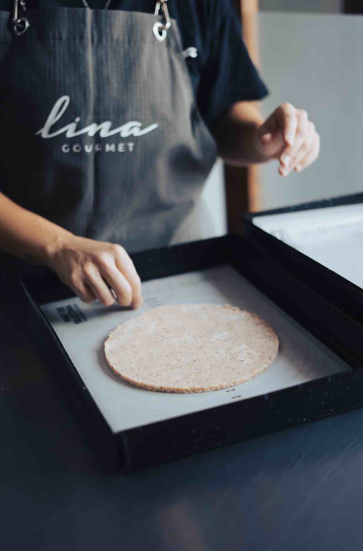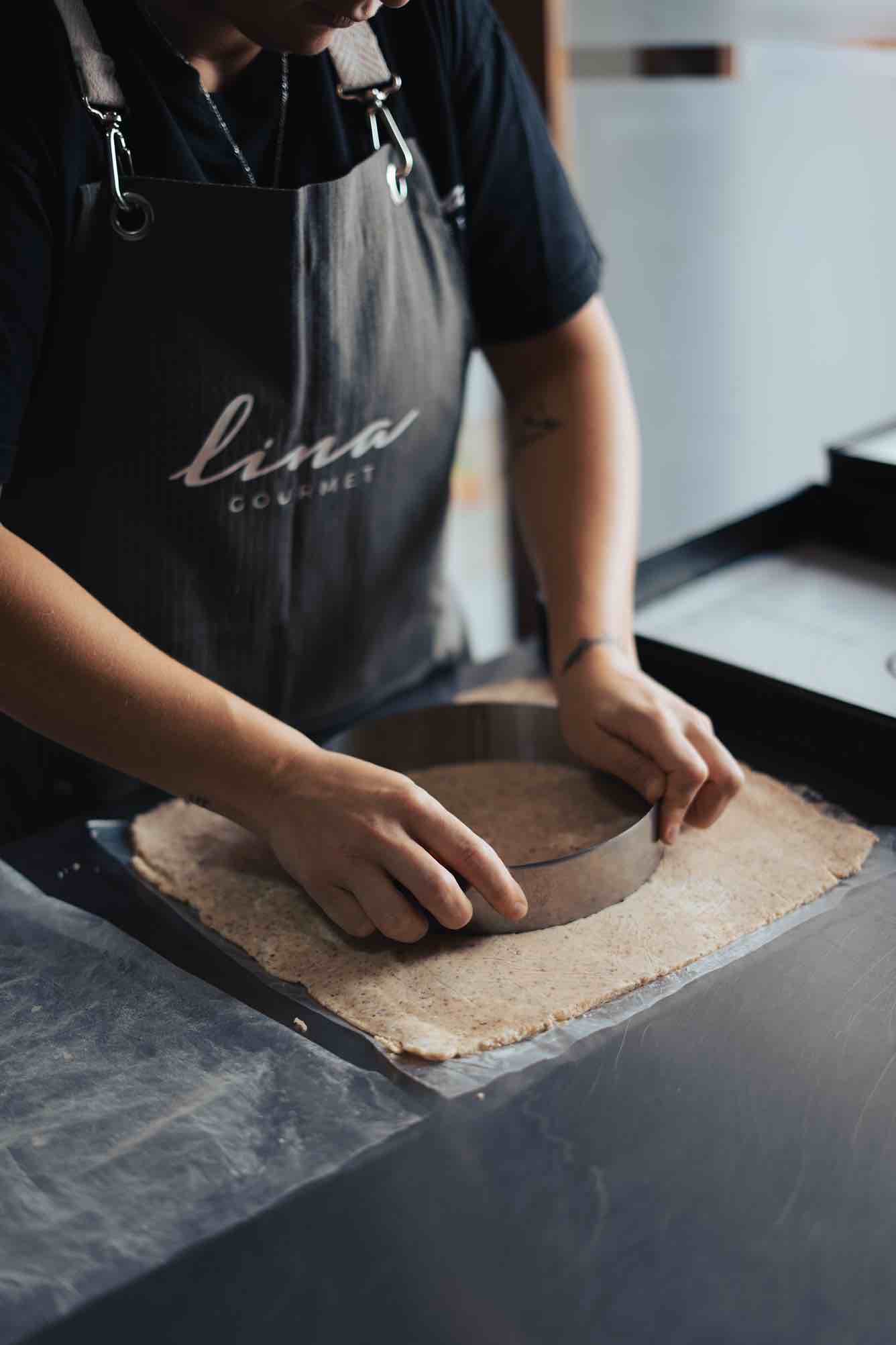 Llevar al freezer durante 30 minutos o hasta que esté bien firme. Una vez que la masa esté en su punto, retirar y cortar 2 discos (capas) del tamaño deseado. “Es importante que esté bien fría la masa para que no se expanda ni pierda la forma deseada. No hace falta tener discos cortantes como el nuestro que mide 20 cm de diámetro, puede usarse otro objeto o darle la forma deseada”.