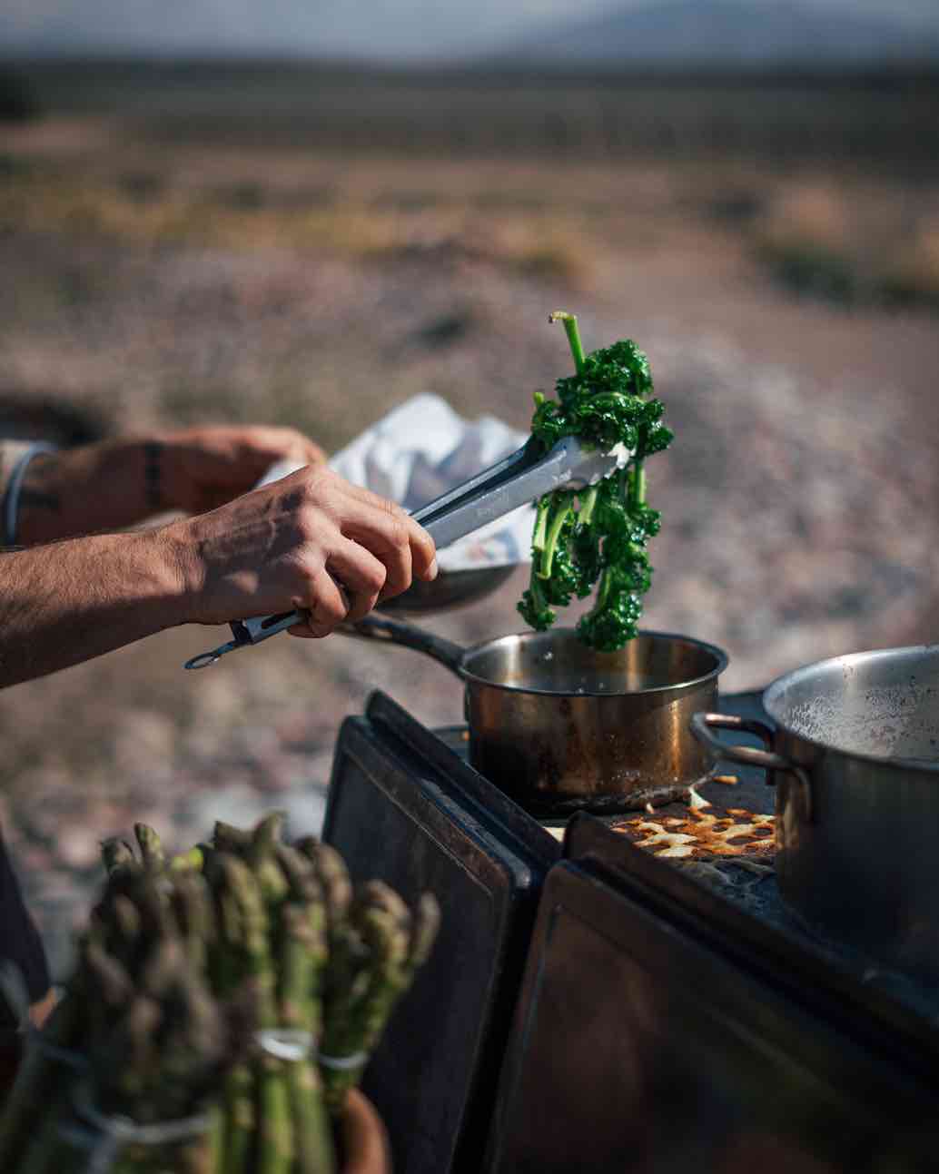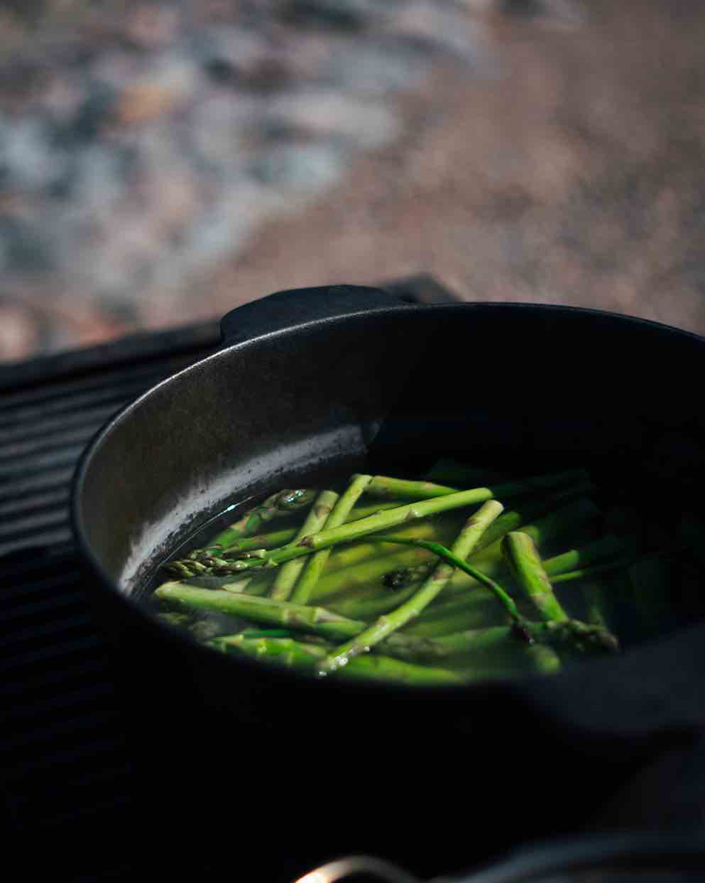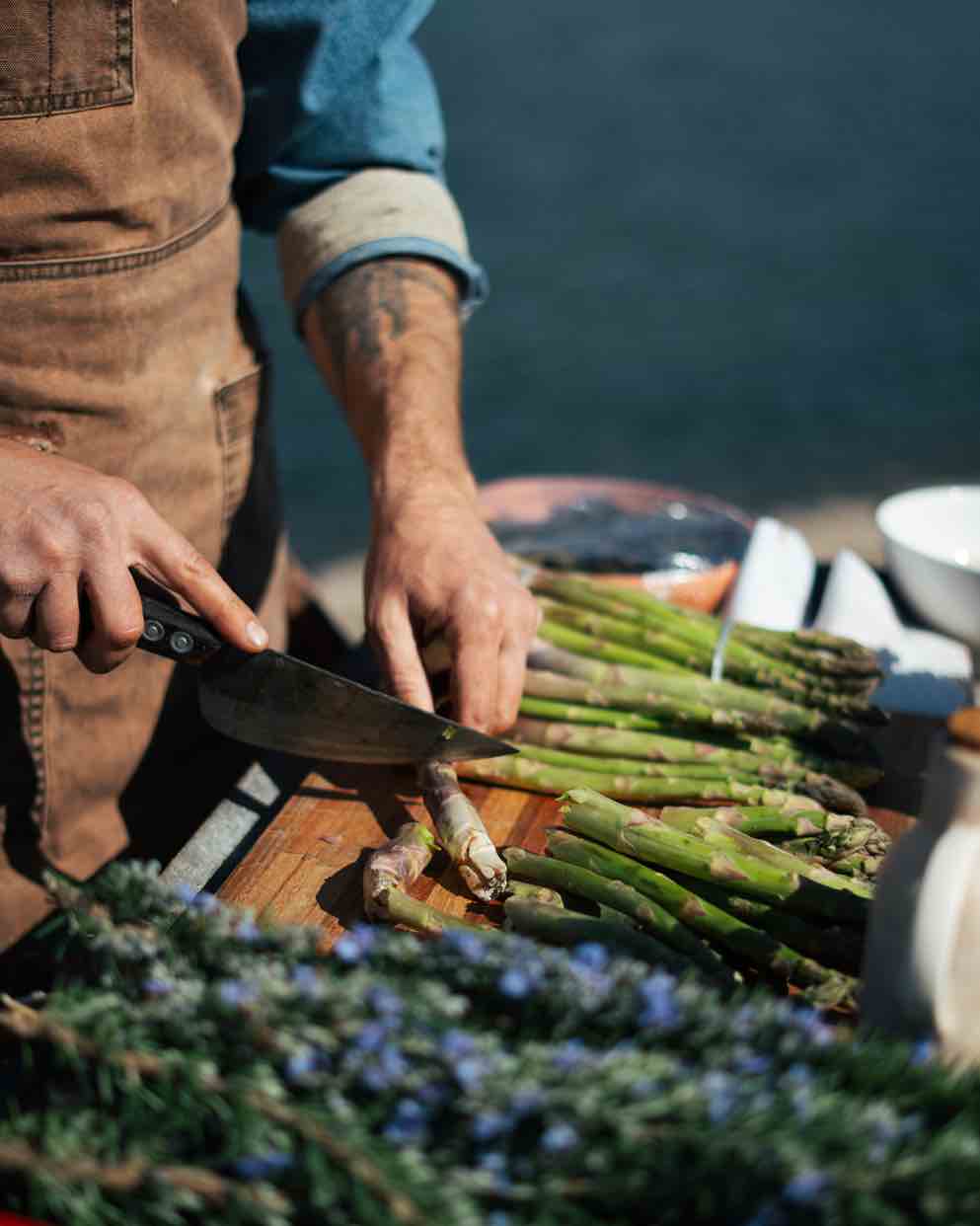 La temporada de espárragos es ahora y los producidos en San Carlos brillan como los mejores del país. Diego propone hacerlos de maneras diferentes pero partiendo desde un mismo punto: blanqueados en agua de mar; a partir de ahí explora dos caminos: uno más clásico, con impronta italiana; y el otro, más atrevido, con guiños asiáticos.