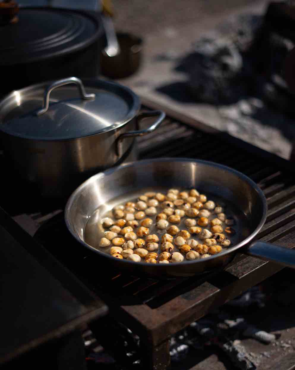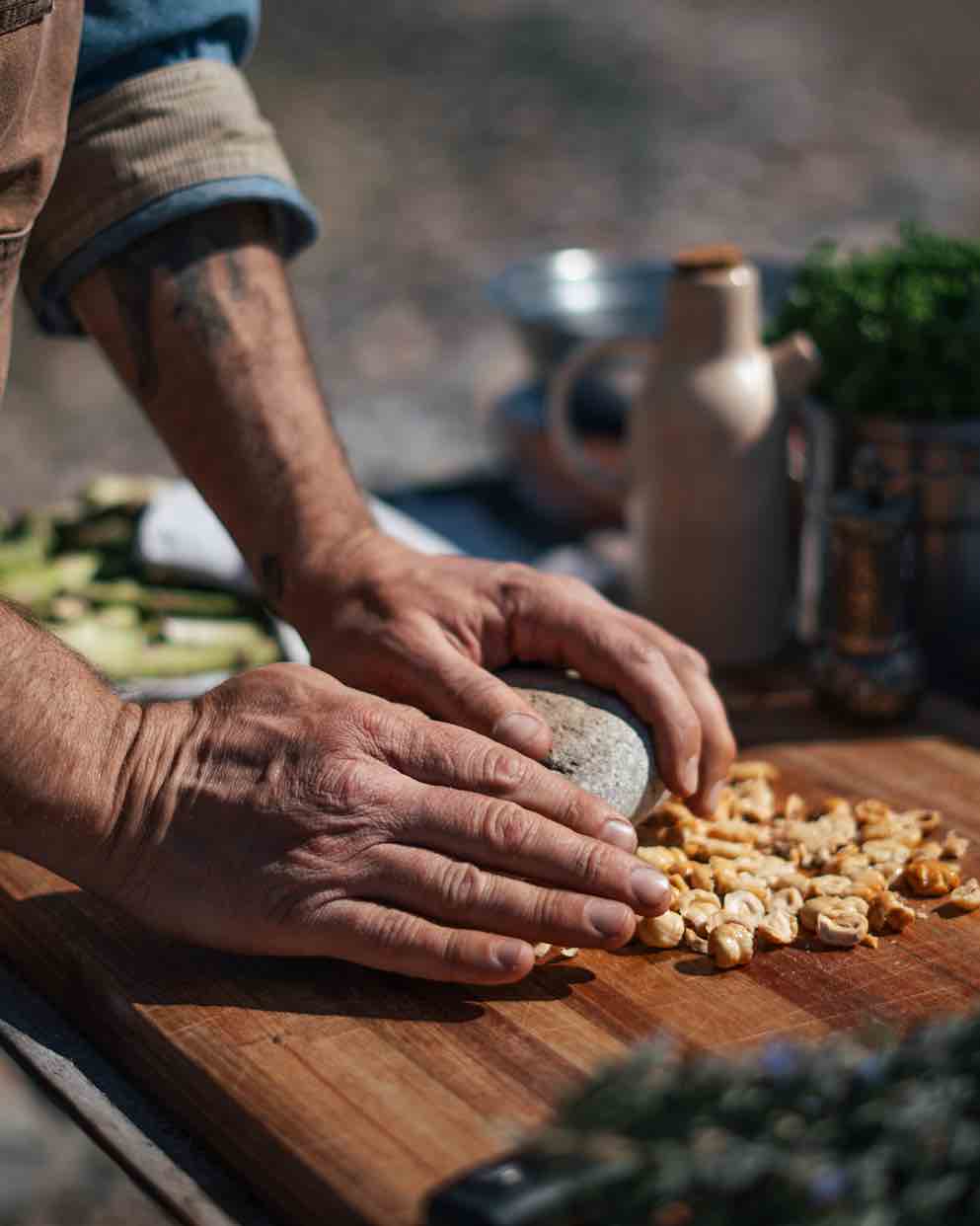 Moler en mortero hasta obtener textura gruesa, “romperlas no en pedazos grandes pero tampoco como una harina”. Mezclar con 50 grs. de azúcar negra y 20 grs. de sal entrefina. Reservar.