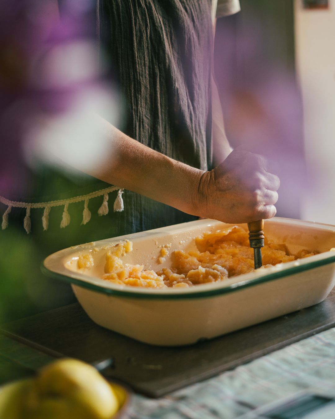 Retiramos la fruta de la olla y la cortamos; limpiamos bien el centro (guardando ese corazón con semillas y pectina en un bowl y dejándolo aparte para la jalea) y molemos la carne del membrillo para obtener el puré. “Recomiendo usar un pisa papa o la moledora de carne para obtener un grosor justo”.