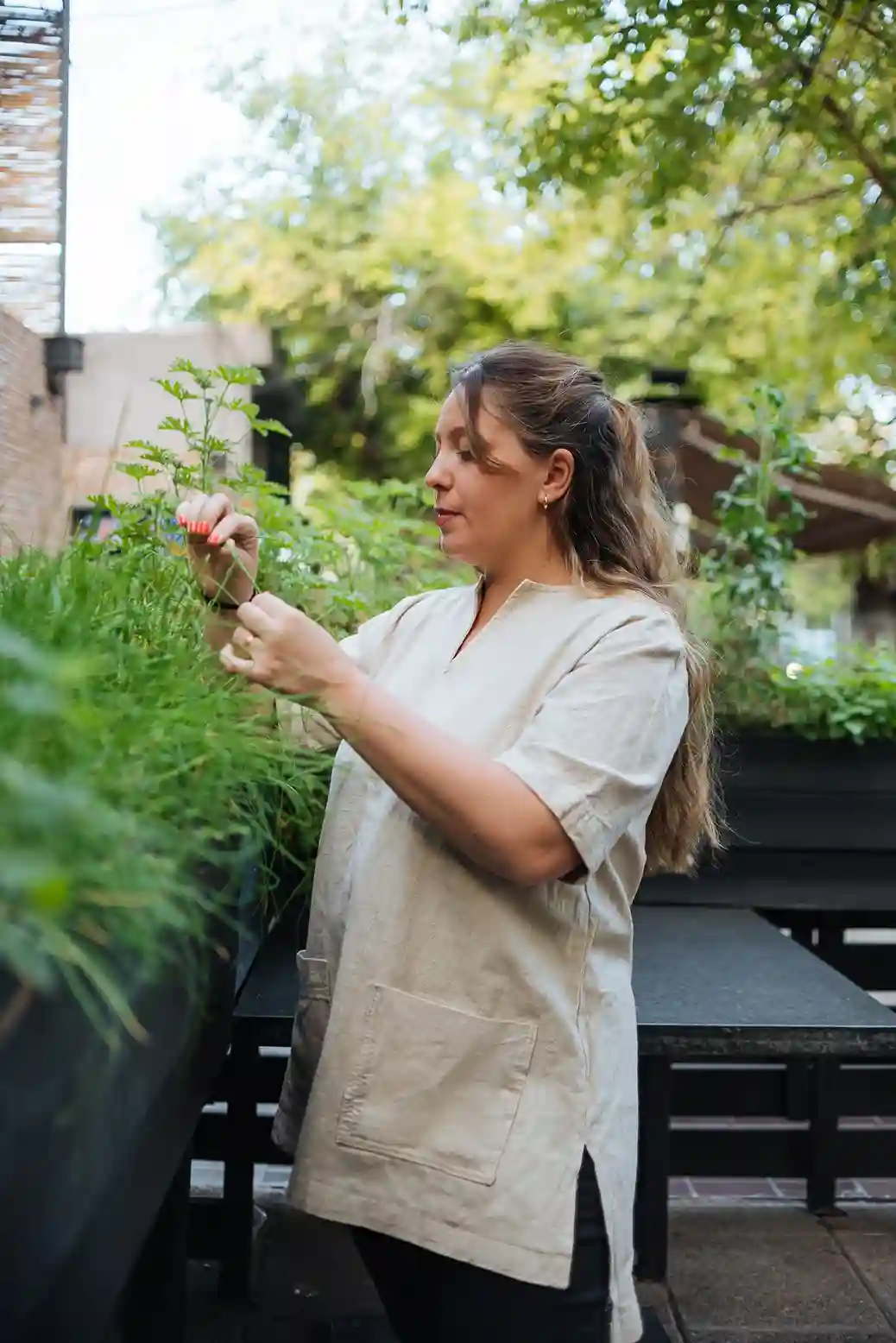 «La bajada de línea de la marca es ‘identidad hecha tela’. No es lo mismo un restaurante en una bodega que uno en el centro. Entonces, buscamos géneros más fluidos o más estructurados, colores que representen a nuestro cliente, bordados que personalicen la prenda y hablen del espíritu del restaurante”, explica.