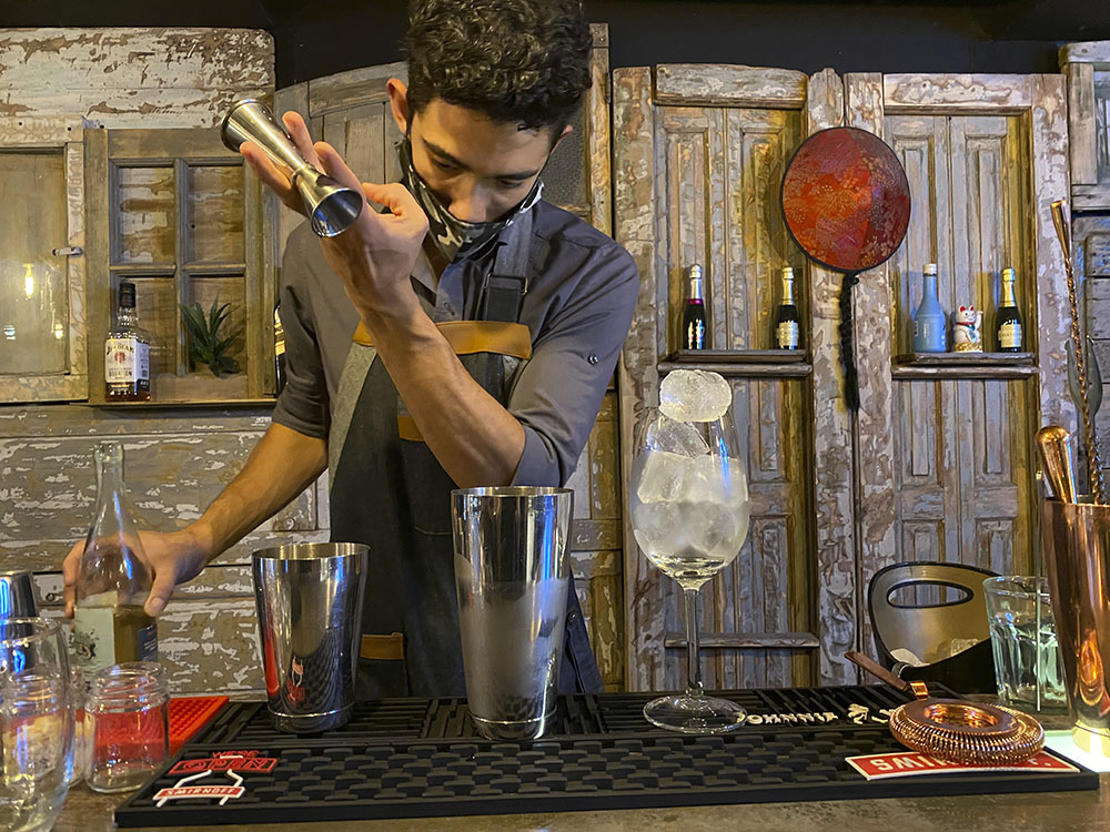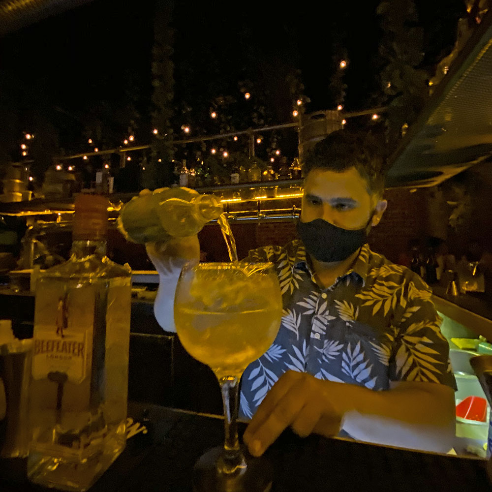 Didier Sosa pausó su barra agitada para prepararnos un Menos,es más, el cual lleva gin, tónica, angostura, cáscara de naranja y menta.