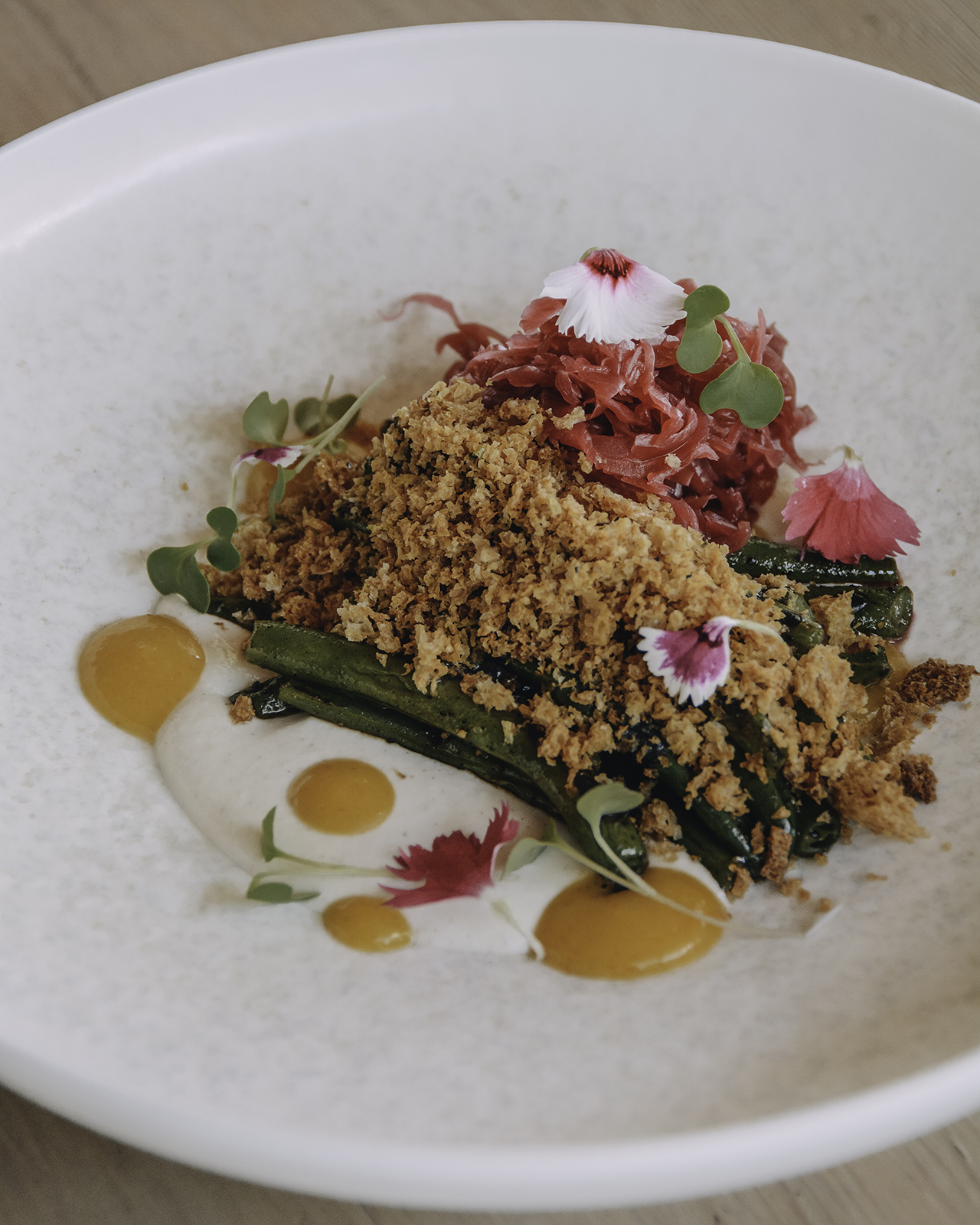 A la mesa llegaron dos platos veggies que fueron furor: los Choclos baby con chutney de remolacha, aceite de perejil, cuartirolo «La Linqueñita» y coco tostado. Por otro lado una explosión de colores: chauchas asadas y desglasadas con una kombucha de sandía, ajo blanco, quinotos, tahine negro de la casa, pangrattato y chucrut. Dos platos repletos de vegetales en diferentes texturas y sabores, combinados con cremosos y crocantes que hacían de ellos un bocado que cerraba por todos lados.