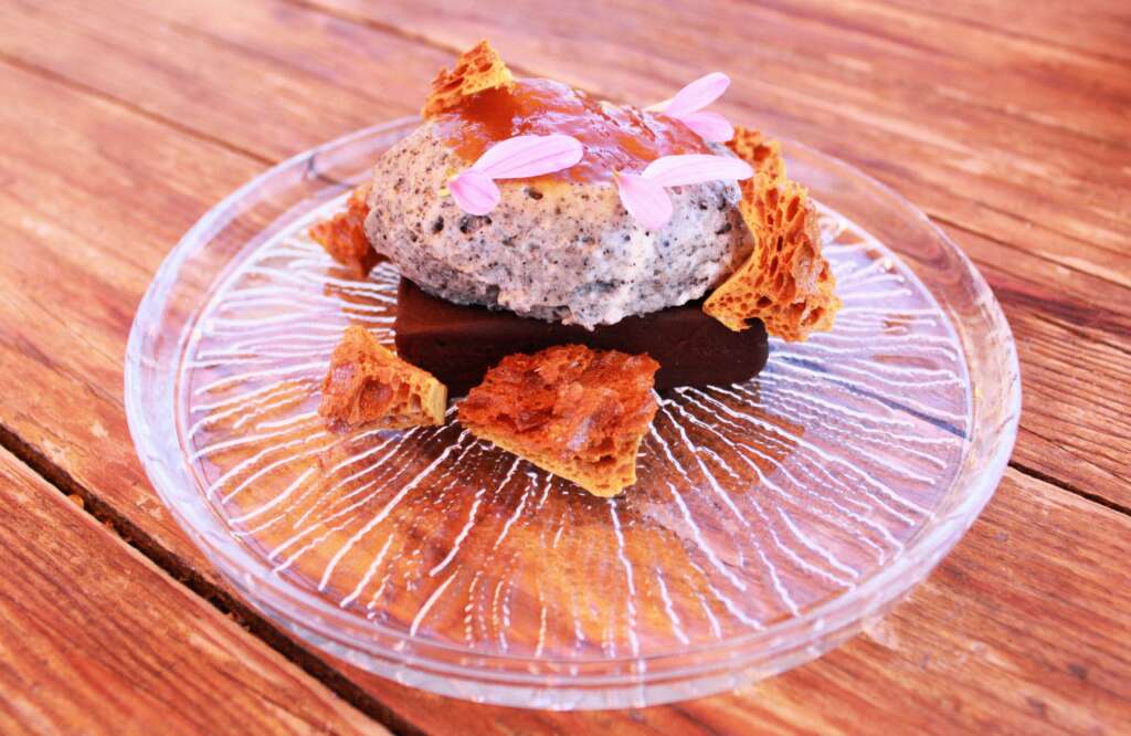 Los dulces del final tuvieron toda la originalidad, nuestro favorito fue la marquise de chocolate amargo, con un mouse de queso mascarpone y semillas de sésamo negro, mermelada de duraznos y peras y honeycomb de miel de ajo, el crocante final para un gran postre.
