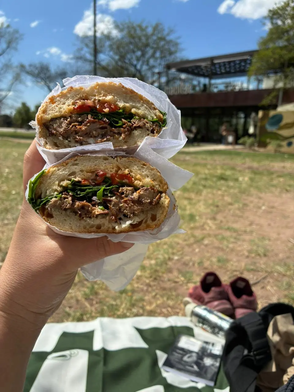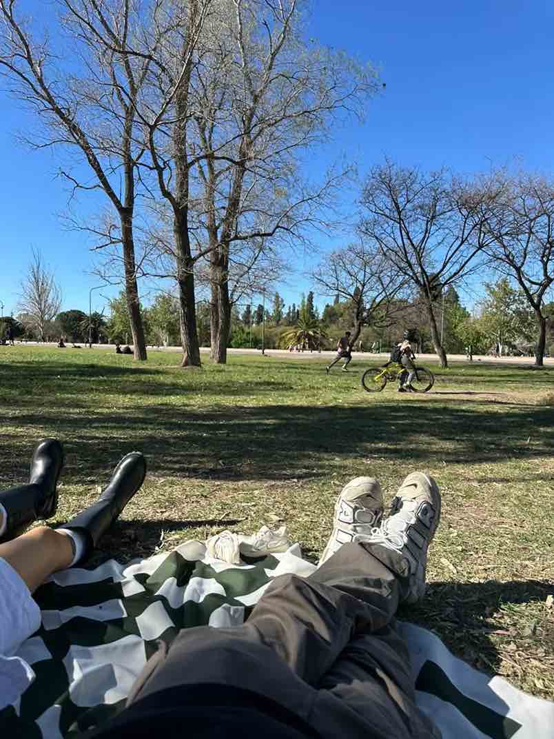 En pleno Parque San Martin frente a Hábitat hay un prado verde que invita a extender una manta y dejar pasar la tarde. Podés pedir sanguchitos, porciones de pizza y falafel y lo que quieras tomar y armar tu picnic ahí mismo, entre árboles y bicicletas.