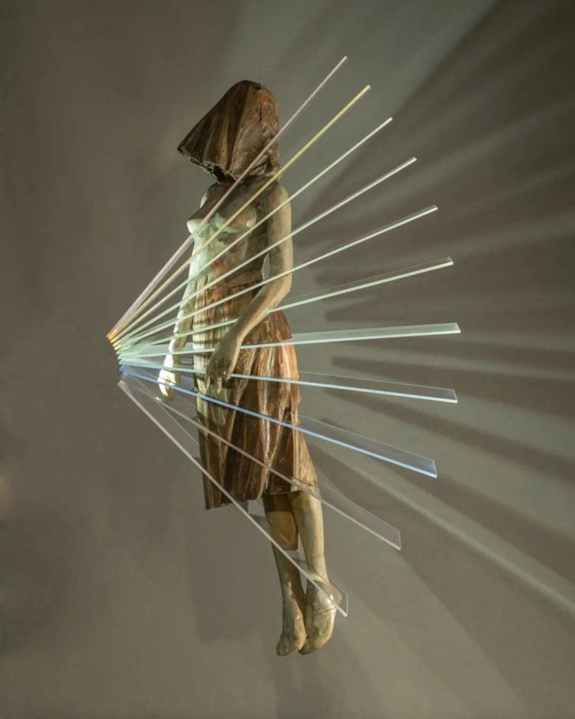 Junto a Iván Delhez, Fernando presenta una talla en pino patinada que irradia luz, gracias al acrílico coloreado que es obra de Delhez.